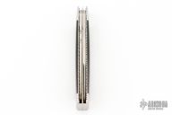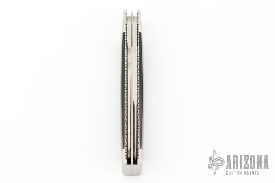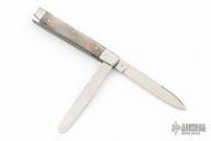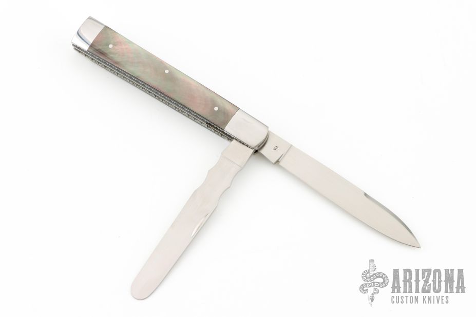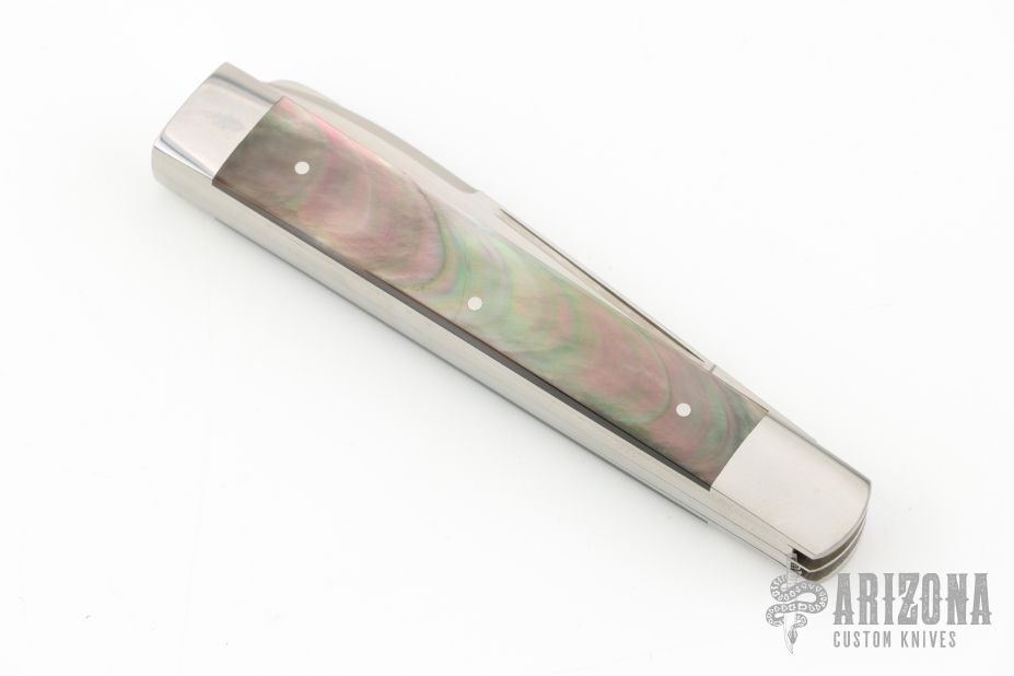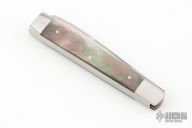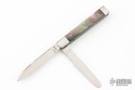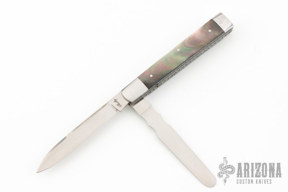 This 2-Blade Doctor's Knife by Eugene Shadley features hand rub satin finished drop point blades with nail nick and longpull. One of the blades is a spatula. The handle has mirror finished stainless steel covers with black lip pearl inlays, stainless steel pins, and stainless steel springs. Has half-stop, flush in all positions. Comes in a knife pouch with COA and catalog. Has a couple light scuffs, excellent condition.