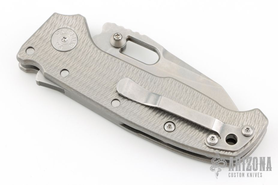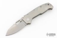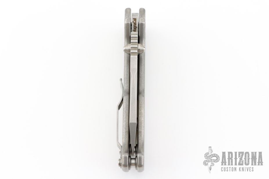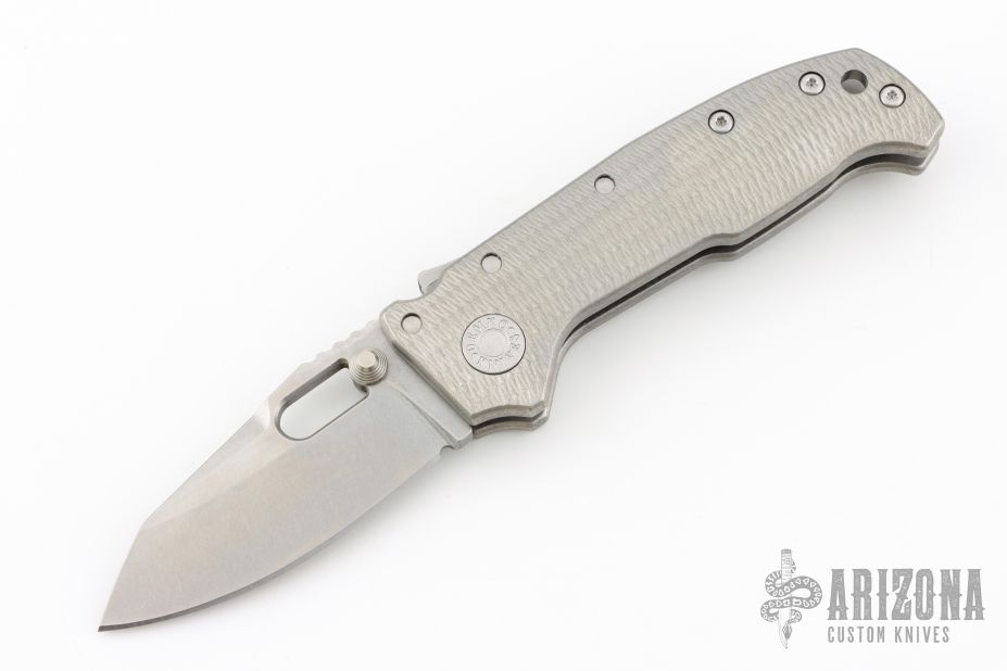 This AD20 by Andrew Demko features a stonewash finished blade with notched thumbrest, thumbhole and dual thumbstuds.  The handle has a textured stonewash finished titanium frame with a tip up titanium clip and "Shark" lock release on the spine. Comes with original box. MagnaCut Blade. Excellent condition.