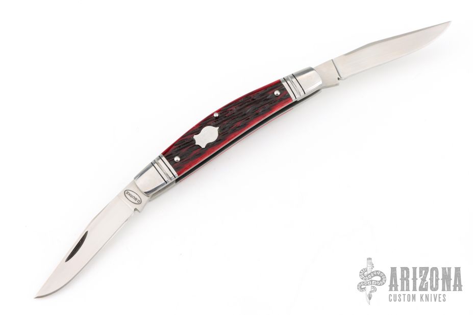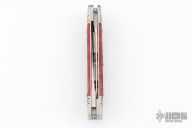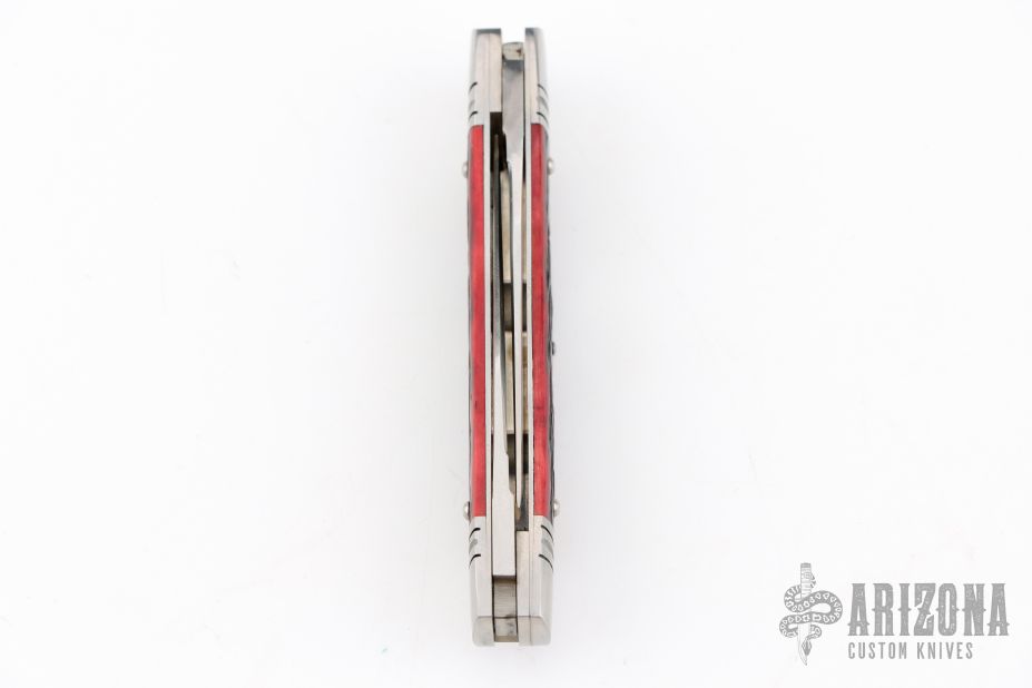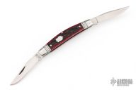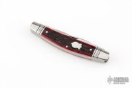 This 2-Blade slipjoint by Dan Burke features hand rub satin finished blades with nail nicks. The handle has threaded stainless steel bolsters, red jigged bone covers with stainless steel liners, escutcheon, and spring. Has half-stops, flush in all positions. Has a couple light scuffs, otherwise Excellent condition. Marked "1" in the ricasso.