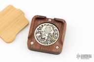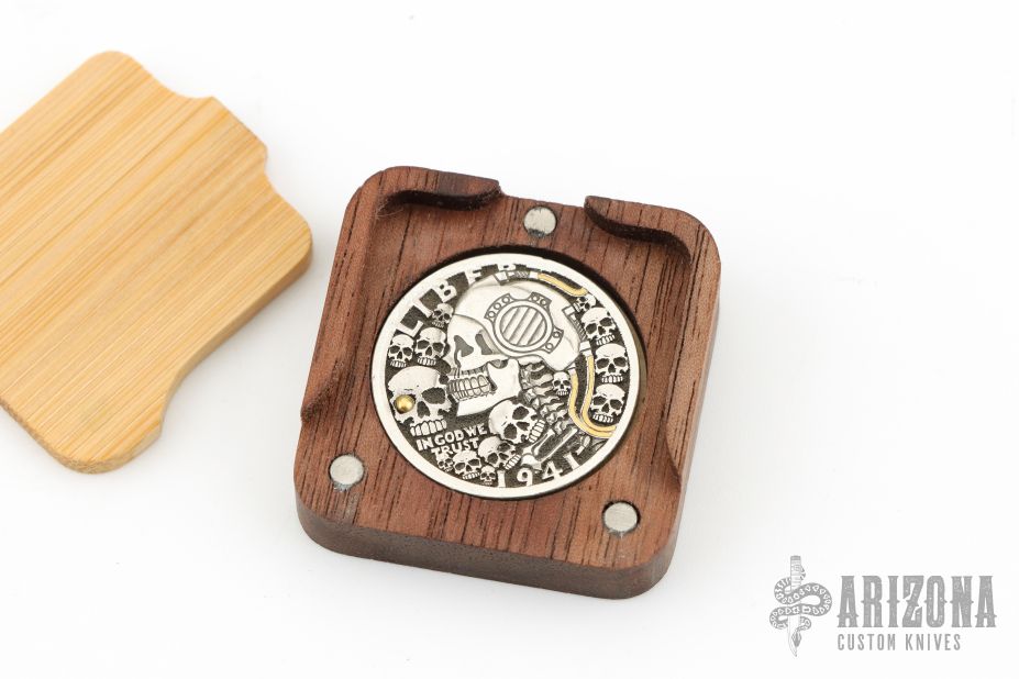 This sole authorship "Hobo Nickel" coin was created by Tom Sterling using a unique combination of advanced technologies and ancient hand engraving and carving methods.  Techniques include state-of-the-art laser engraving, and hand carving and hand engraving, each method carefully chosen for its own best effect.  Carved with a rock wall and skull theme with hand engraved 24 karat gold inlay, from a US 1941 90% silver 25 cent coin. Black Walnut and bamboo magnetic presentation box included. Comes with COA. New from maker!