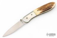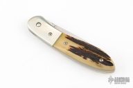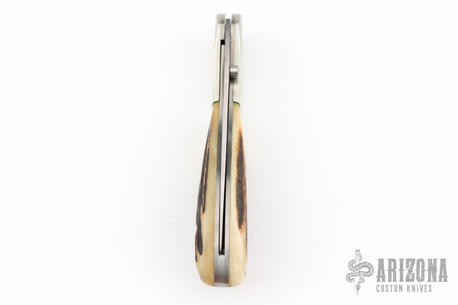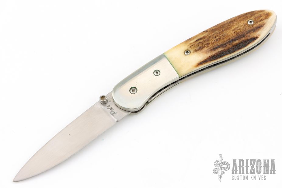 This Linerlock by Pete Dunham features a hand rub satin finished blade with single thumbstud. The handle has polish finished nickel silver bolsters, satin titanium liners, stag scales and steel backstrap. Has a couple light scuffs, excellent condition otherwise.