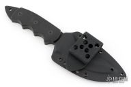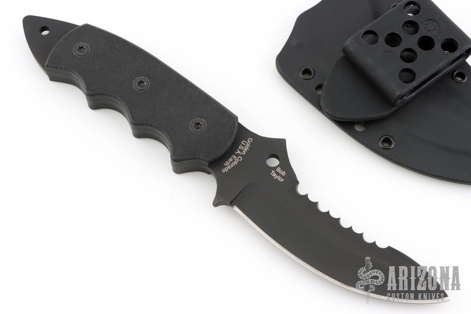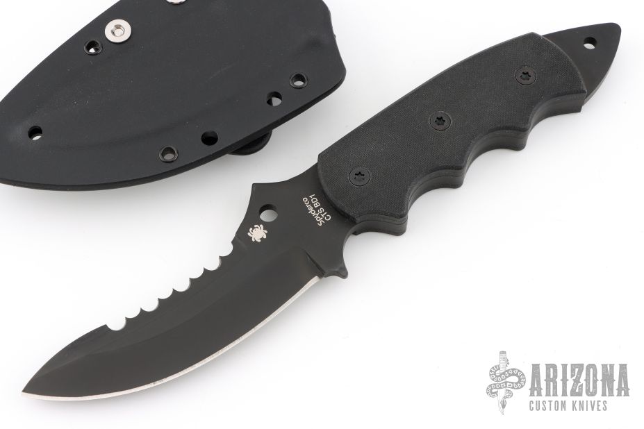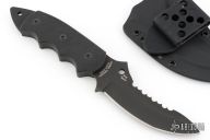 This Pygmy Warrior from Spyderco features a black coated upswept blade with sawteeth on spine. .168" blade stock and 1.52" blade depth. The handle is comprised of black G10 scales over full tang construction. Exposed tang pommel with lanyard hole. Includes original box, papers and kydex sheath. Excellent condition.