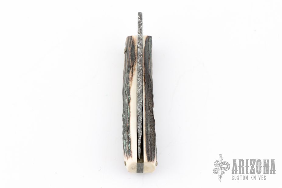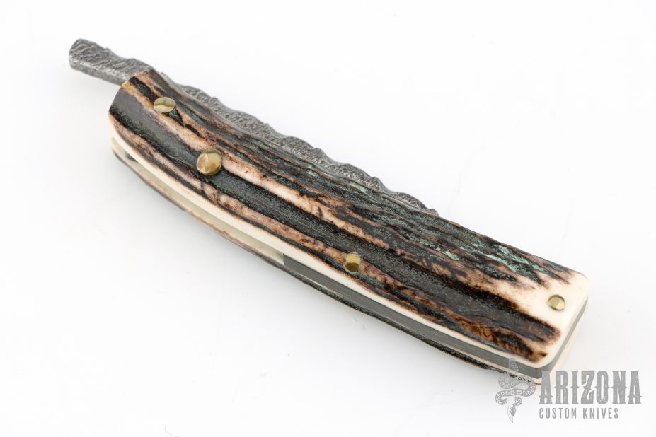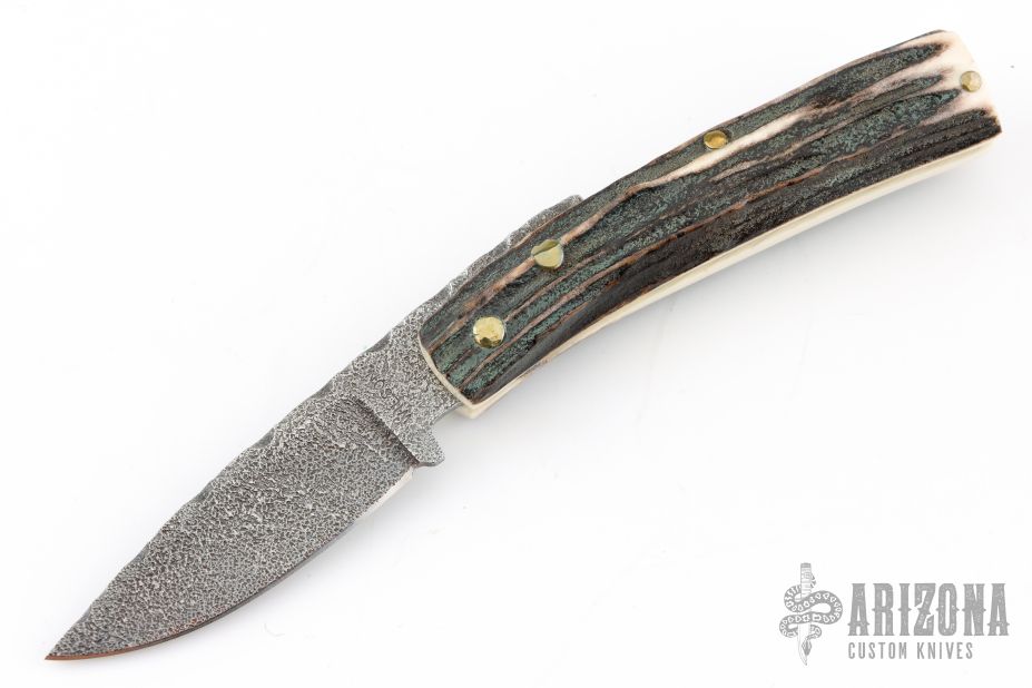 This friction folder by Mike Wilson features a textured blade with a file worked blade spine, and friction folder style opening/closure. The handle is made from stag slabs with a micarta backstrap. Excellent condition.