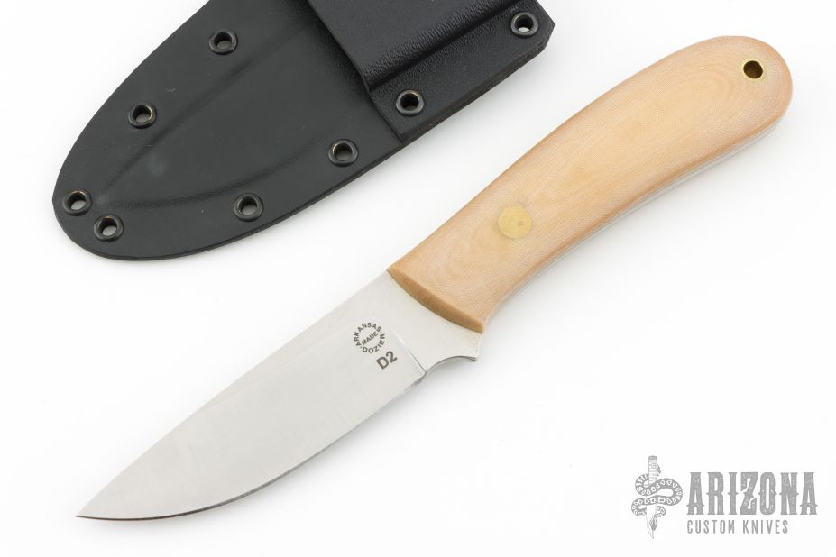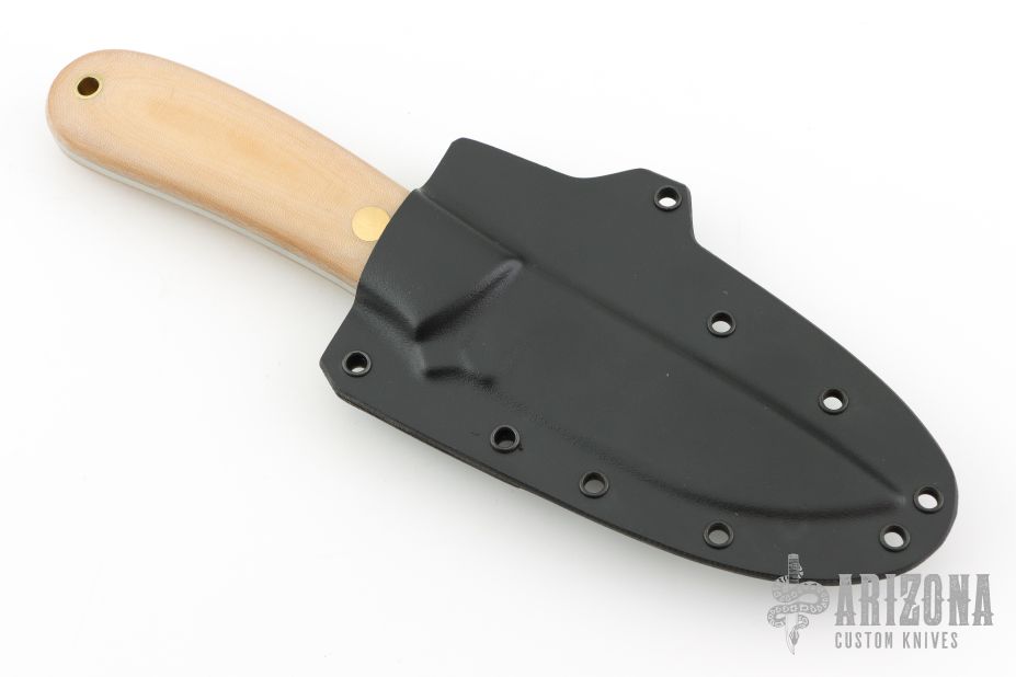 This K-16 Yukon Pro Skinner by Dozier Knives features a satin finished blade with .130" blade stock and 1.029" blade depth, full tang construction. The handle has bone linen micarta scales, brass pins and lanyard hole. Comes with kydex sheath with belt clip. New from maker.