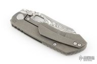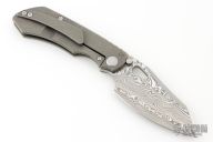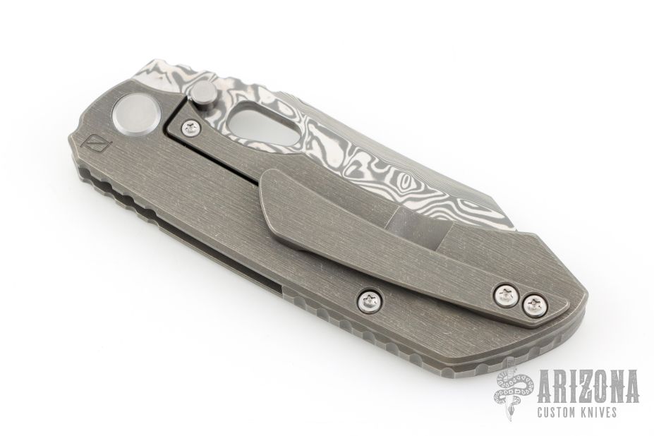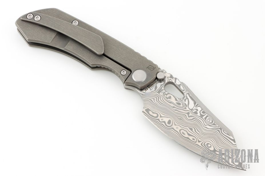 This Evolution 4.0 by Custom Knife Factory features a polished Damasteel blade with notched thumbrest and thumbhole. The handle has a tumbled bark finished titanium frame with a notched backspacer and a matching tip-up pocket clip. Comes with maker's velcro case, extra hardware, and COA. Nice detent, lockup and blade seating.  #57 and dated 2-24.  Excellent condition.
