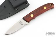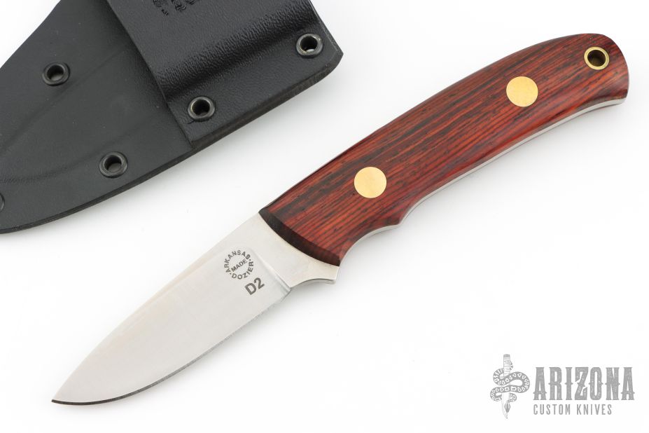 This K-14 by Dozier knives has a satin finished drop point blade with full tang construction, .127" blade depth and .831" blade stock. Has cocobolo scales with brass pins and lanyard hole. Comes with a kydex sheath. New from maker.