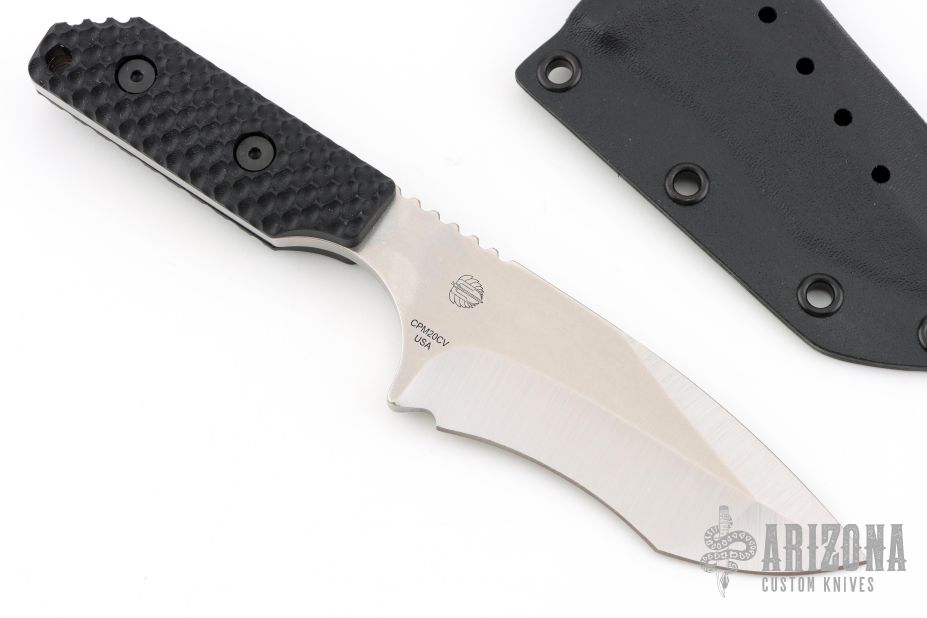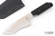 This EBDB by Mick Strider features a satin finished compound ground blade with stonewashed flats and notched thumbrest, .225" blade stock and 1.615" blade depth, full tang construction with black gunner grip G-10 scales. Comes with a Kydex sheath. New condition.