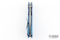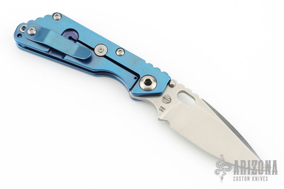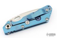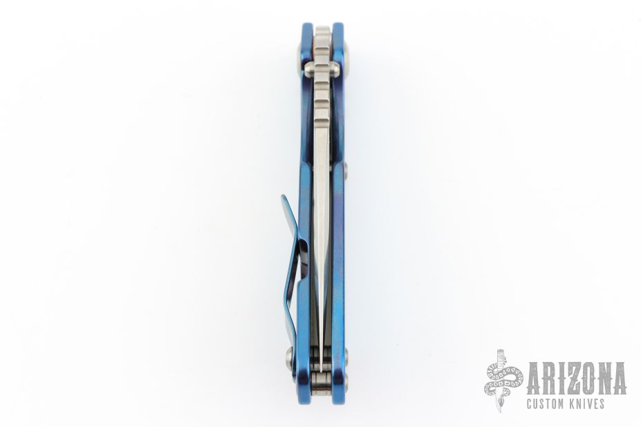 This Mick Strider Performance series SNG framelock folder features a stonewashed drop point blade with thumbhole and notched thumbrest. The handle has a Cobalt DLC titanium frame with titanium clip, tip up carry. Jimping on blade spine. Includes Hinderer "Lock Bar Stabilizer" for maximum reverse lock retention. Nice lockup, detent, and blade seating. New condition.