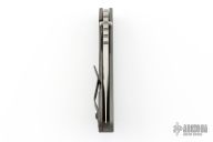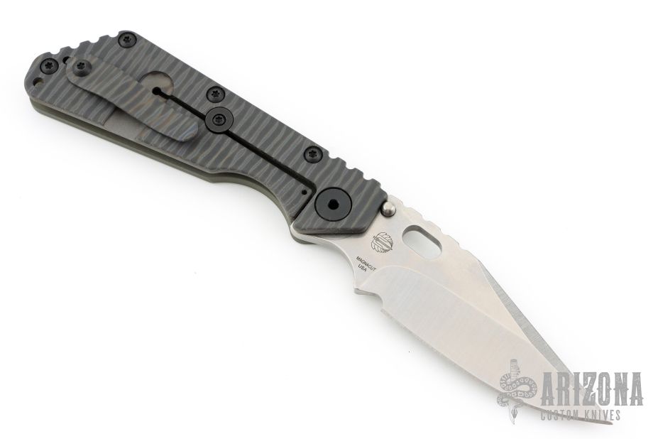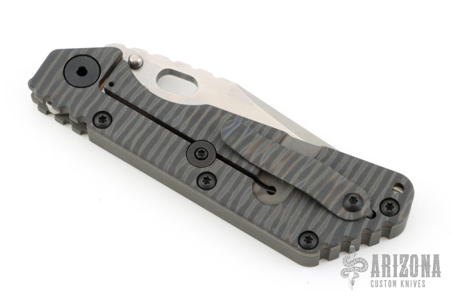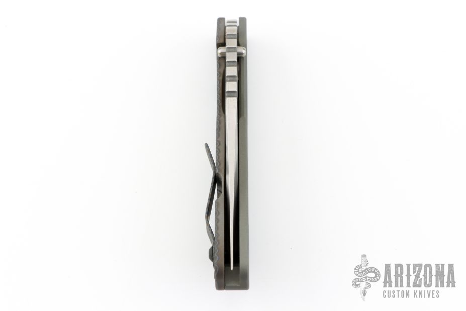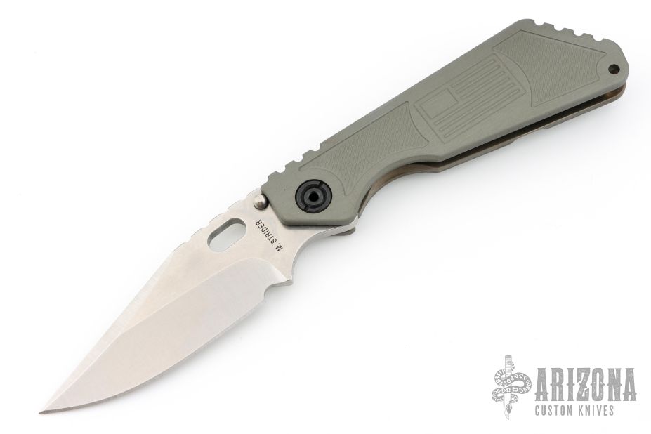 This Mick Strider SMF Bowie framelock folder features a stonewashed blade with thumbhole and notched thumbrest. The handle has a sage green aluminum and flamed titanium frame with titanium clip, tip up carry, lockbar stabilizer. Jimping on blade spine. Nice lockup, detent, and blade seating. New condition.