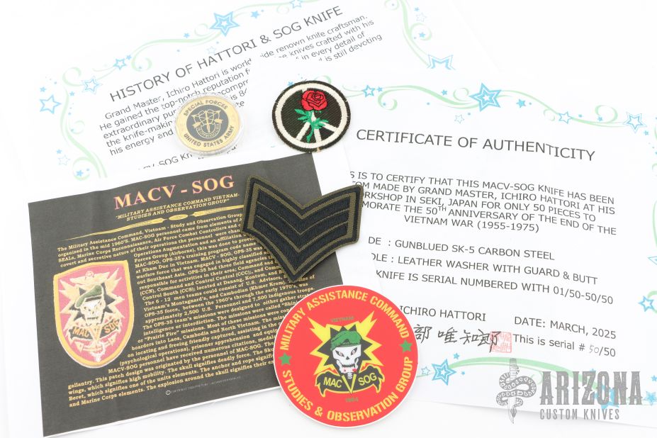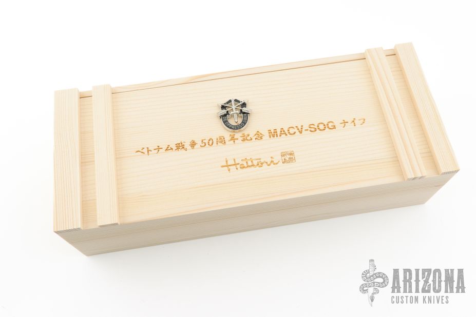 The knife comes with Black leather sheath with sharpening stone pocket, and Presentation Wooden Box with "De Oppresso Liber" SF emblem attached on the lid. You will also find Special Forces coin, MACV-SOG sticker and U.S. Army patches included in the box. The first Serial #01-10 also includes United State Army coin and more patches. Please enjoy the historical treasure knife in a decorative display wooden box with "Certificate of Authenticity" signed by Ichiro Hattori, and "History of Hattori & MACV-SOG Knife" Your choice of the serial numbers 01/50 - 50/50, and the price varies by serial number.