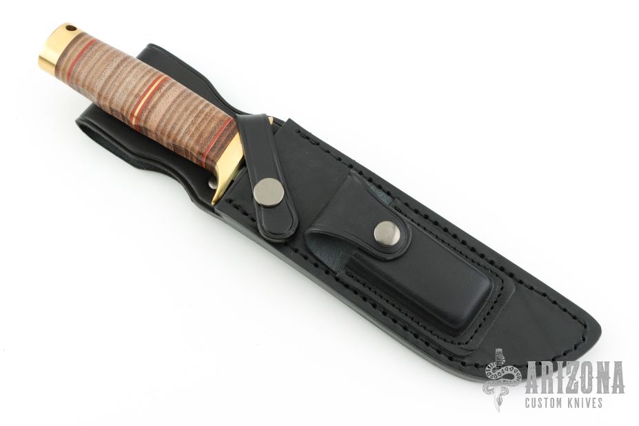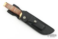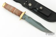 Master Hattori has reproduced 50 special limited Anniversary knives, and just came up in right time of the 50th Anniversary year and month. It features original 6-1/4" Hollow ground Gunblued SK-5 carbon steel Bowie blade etched with "Vietnam War 50th Anniversary 1955-1975" and "50 Limited Edition of MACV-SOG Knife" on blade, and "De Oppresso" Special Forces Crest on tang. Each serial number is engraved on the bolster. The stacked Leather handle has Red Fiber & Gold Brass spacers (Vietnam flag colors) and solid Brass bolster & butt end.
