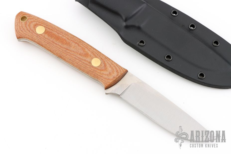 This K-22 Buffalo River Hunter by Dozier Knives features a satin finished blade, .129" blade stock and .911" blade depth, full tang construction. The handle has natural canvas micarta scales with brass pins and lanyard hole. Comes with kydex sheath with belt clip. New from maker.