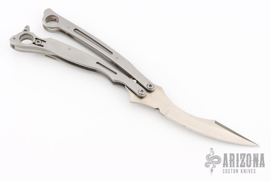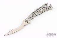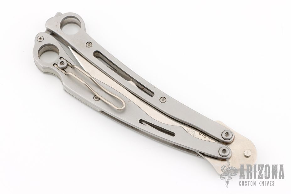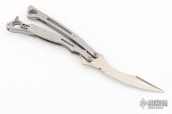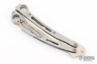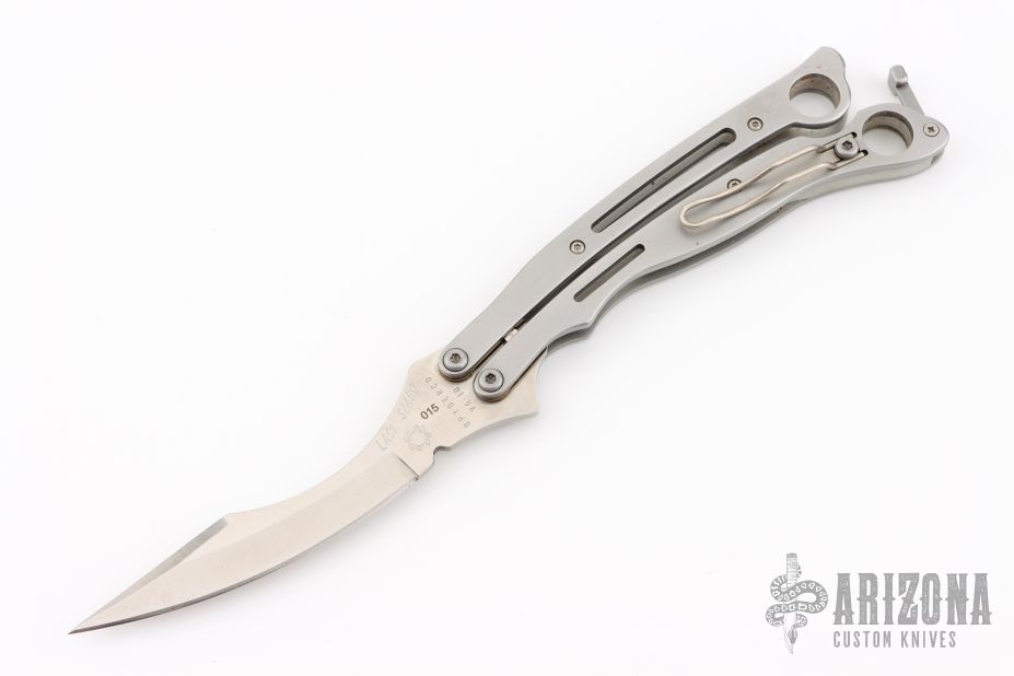 The Szabofly by Spyderco is no longer in production, if features a satin finish blade with swedge. The handle has bead blasted stainless steel handles with a spring loaded latch and a tip up reversible clip. Has light scuffs, otherwise excellent condition. #015