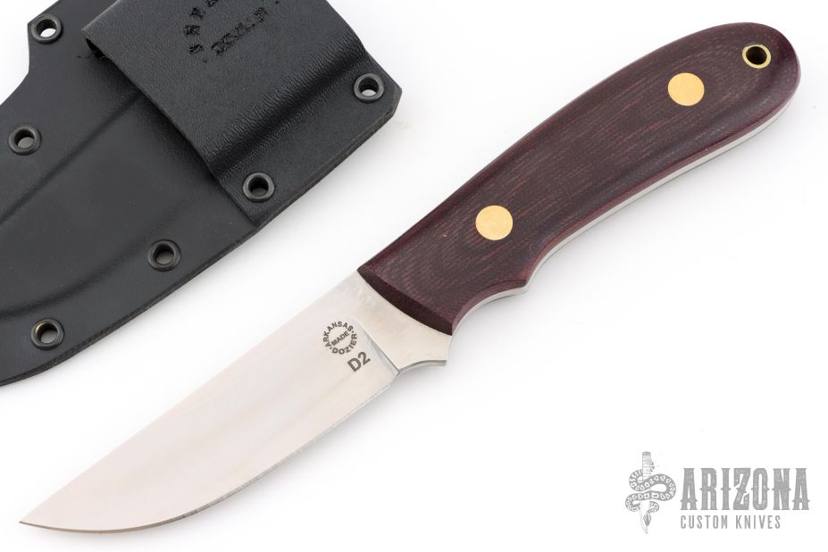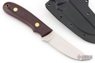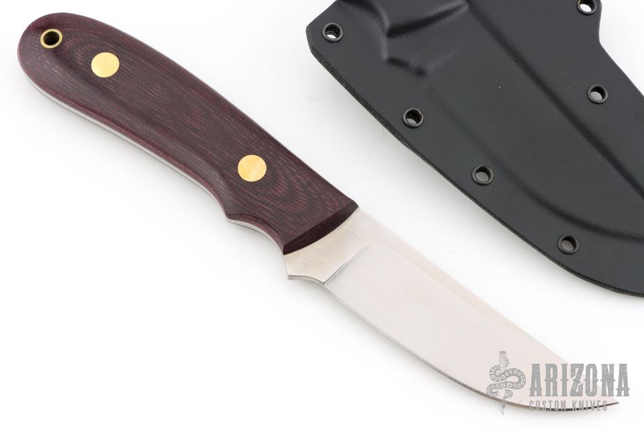 This K-16 Yukon Pro Skinner by Dozier Knives features a satin finished blade with .135" blade stock and 1.034" blade depth, full tang construction. The handle has burgundy micarta scales with brass pins and lanyard hole. Comes with kydex sheath with belt clip. New from maker.