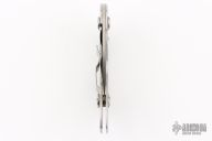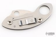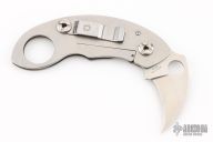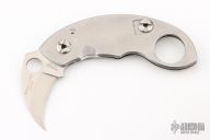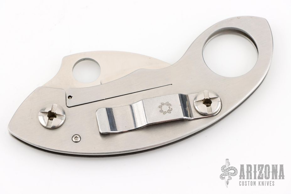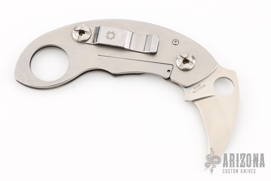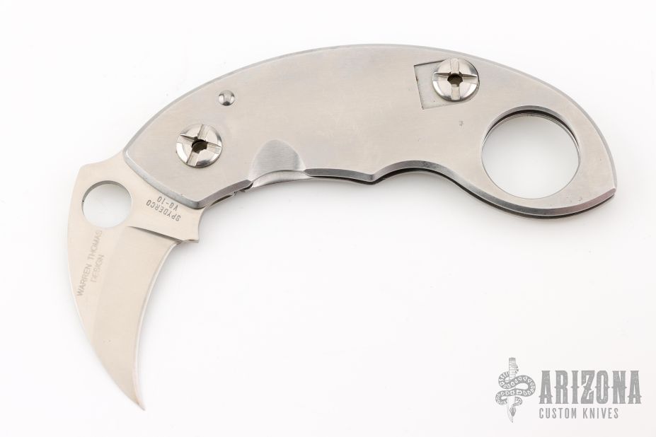 "Our Thomas/Spyderco folding Karambit is all-stainless with an arcing blade shape that carries through into a curved handle creating, in a sense, a large claw. Positioned at the end, for an index or pinky finger, the ring lets you to swing/rotate the blade into different grip positions. When closed an accessible nick/recess in the steel handle channels the thumb to, and then over, the Spyderco Round Hole for immediate blade deployment. To facilitate opening the blade even quicker, the hole is expanded to 13mm in diameter. On the backside, the handle scale is laser cut into a Chris Reeve Style integral Linerlock. The blade is made from VG-10 and double flat-ground with a finger guard behind the cutting edge and a sizable thumb-positioning spine cusp above the hole. These ergonomics merge making the piece feel comfortably curved and easily controlled in the hand. A flat, broad steel clip completes the package and is outfitted with the necessary hardware to position for tip-up/tip-down and left- or right-hand carry. Discontinued Product - No Longer Available." Comes with original box. Has scratches, otherwise good condition.