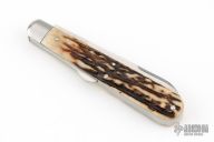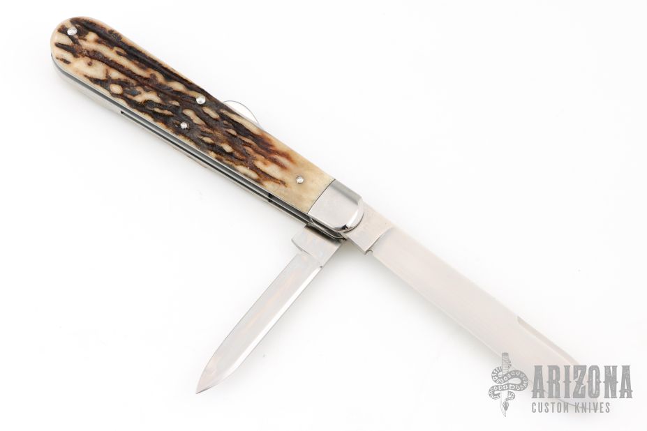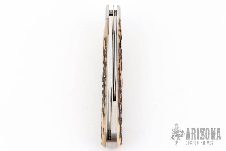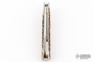 This English Jack by Ken Erickson features two hand rubbed satin finished blades, with nail nicks, and the main blade is a lockback. The handle has stainless fluted bolsters, old jigged bone covers with stainless liners and springs. Has half stop, flush at all positions. Excellent condition.