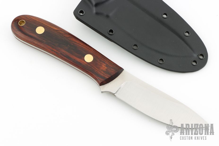 This K-56 Evo Hunter by Dozier Knives features a satin finished blade, .137" blade stock and 1.107" blade depth, full tang construction. The handle has cocobolo scales with brass pins and lanyard hole. Comes with kydex sheath with belt clip. New from maker!