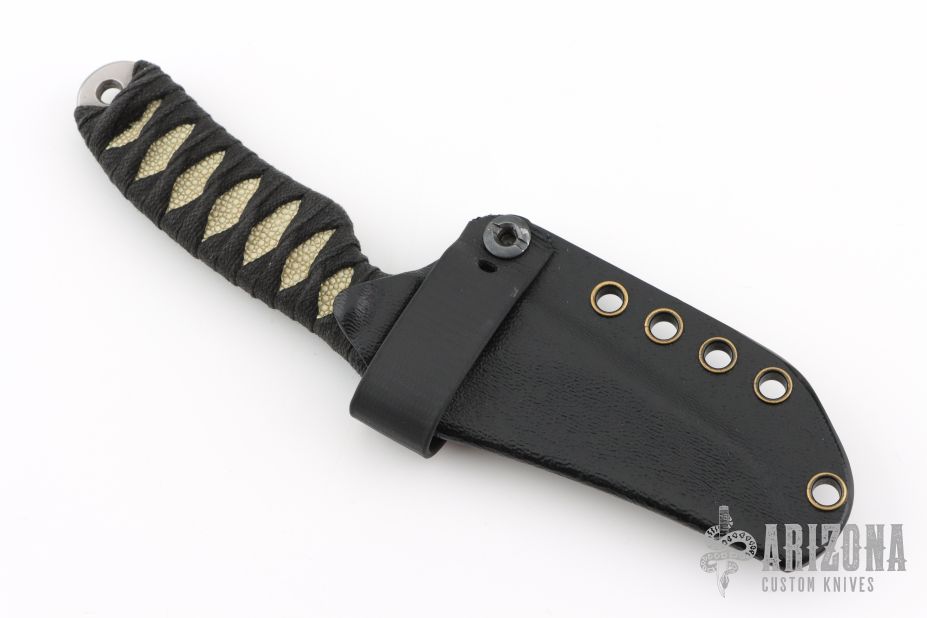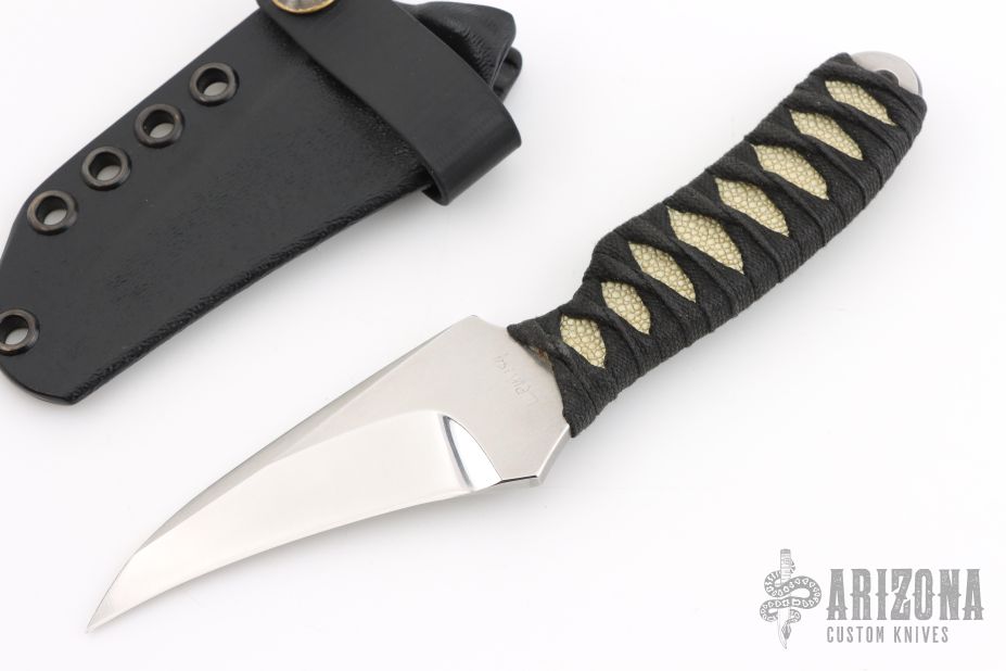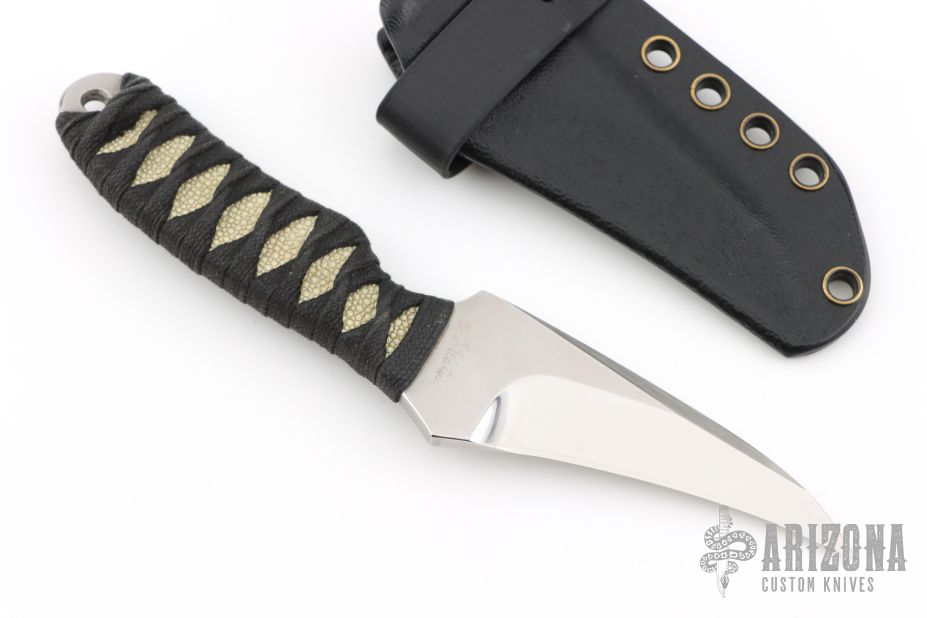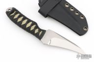 This knife by Joe Watson features a hawkbill a satin finished blade with .161" blade stock and 1.446" blade depth, hidden tang construction. The handle has black cord wrap over a white ray skin underlay. Comes with a kydex sheath. Excellent condition.