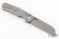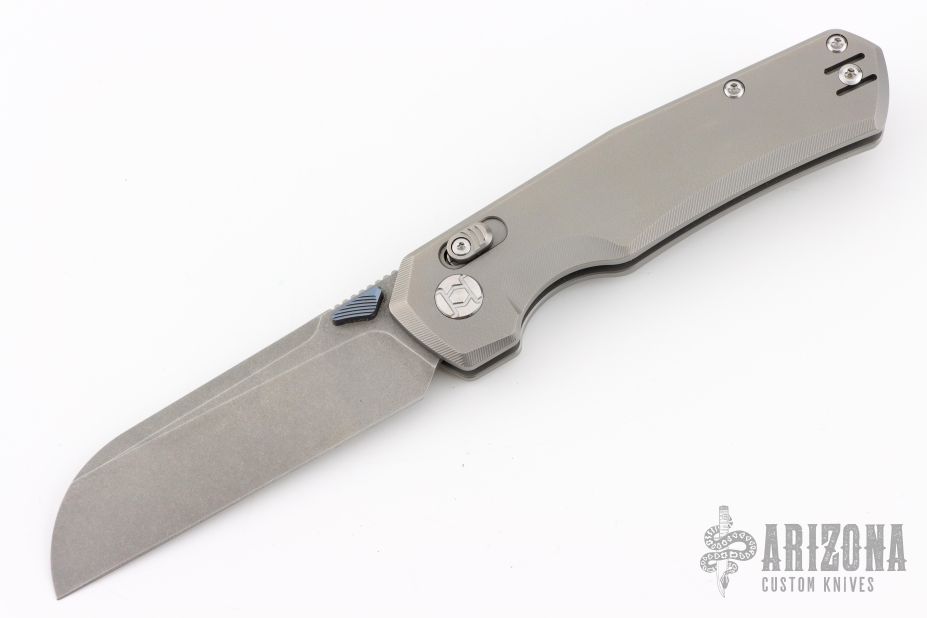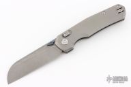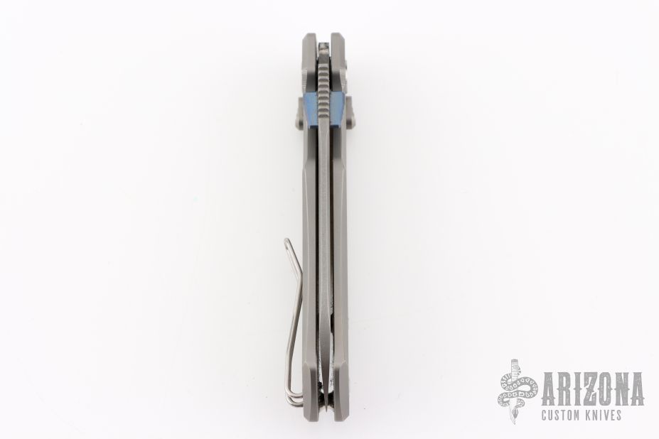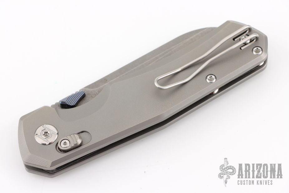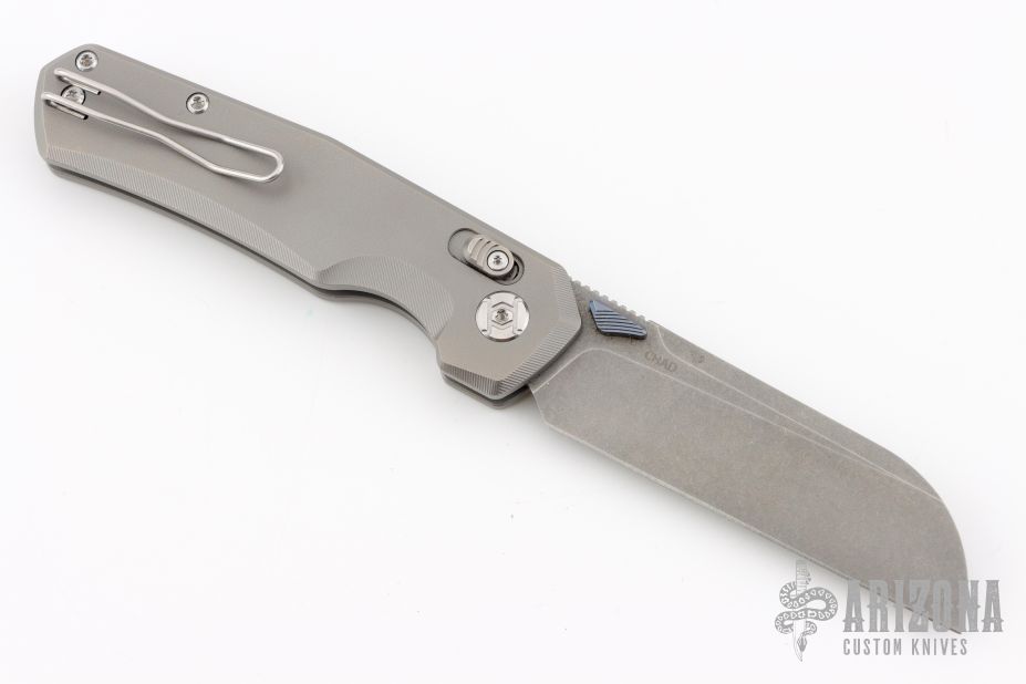 This Chad folder by Kunwu Knives features a satin finished blade with dual anodized titanium thumbstuds and a notched thumbrest. The handle has a textured titanium frame with tip up reversible clip, has a axis style lock. Excellent condition. PM60 steel