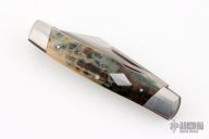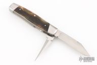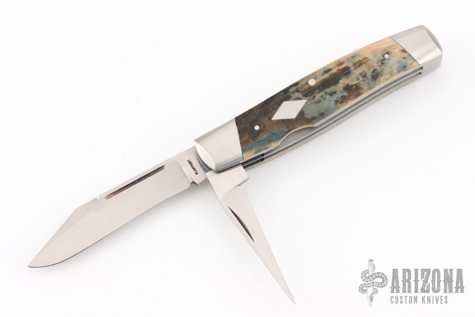 This 2-Blade Cattle knife by Tom Ploppert features hand rub satin finished blades with nail nicks. The handle has stainless steel bolsters, liners and springs with mammoth bone covers and a stainless steel escutcheon. Has half-stops on blades, flush in all positions. Excellent condition.