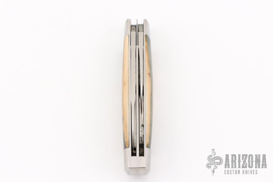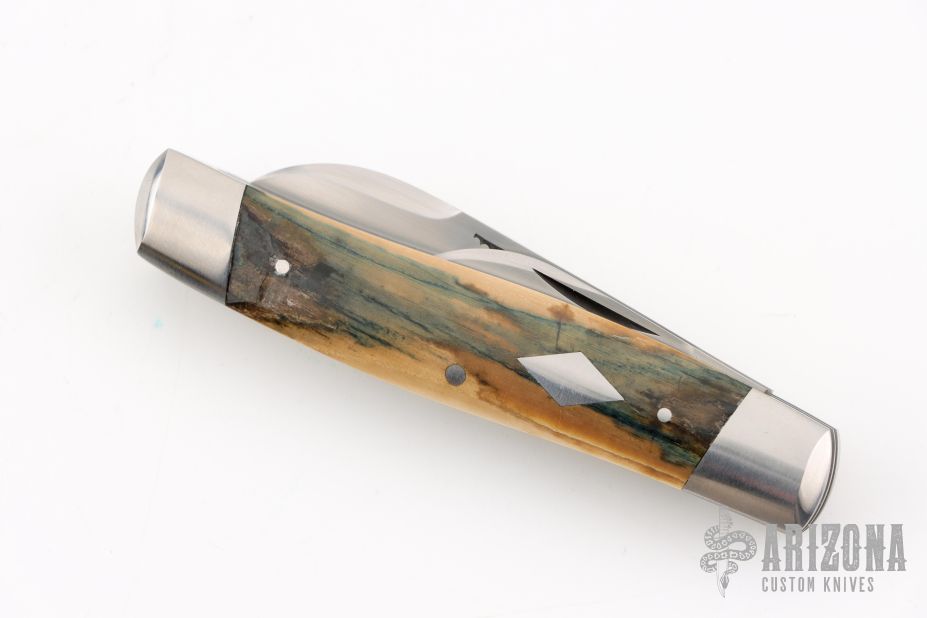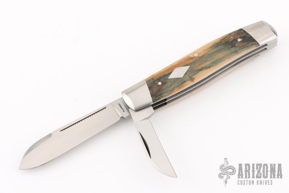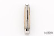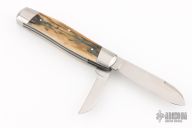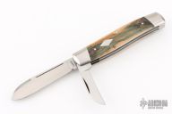 This 2-Blade Cattle knife by Tom Ploppert features hand rub satin finished blades with nail nicks. The handle has stainless steel bolsters, liners and springs with mammoth bone covers and a stainless steel escutcheon. Has half-stops on blades, flush in all positions. Excellent condition.