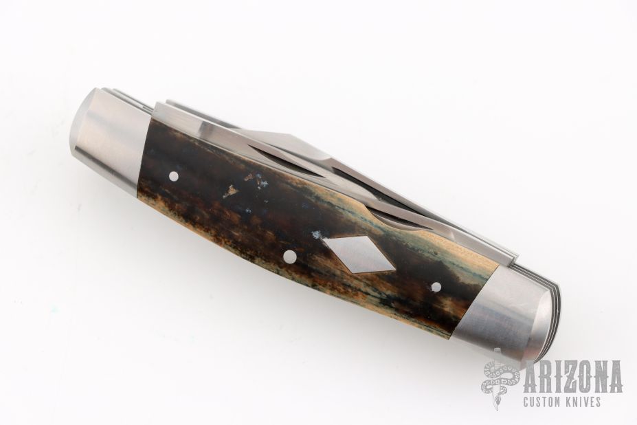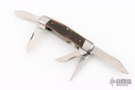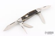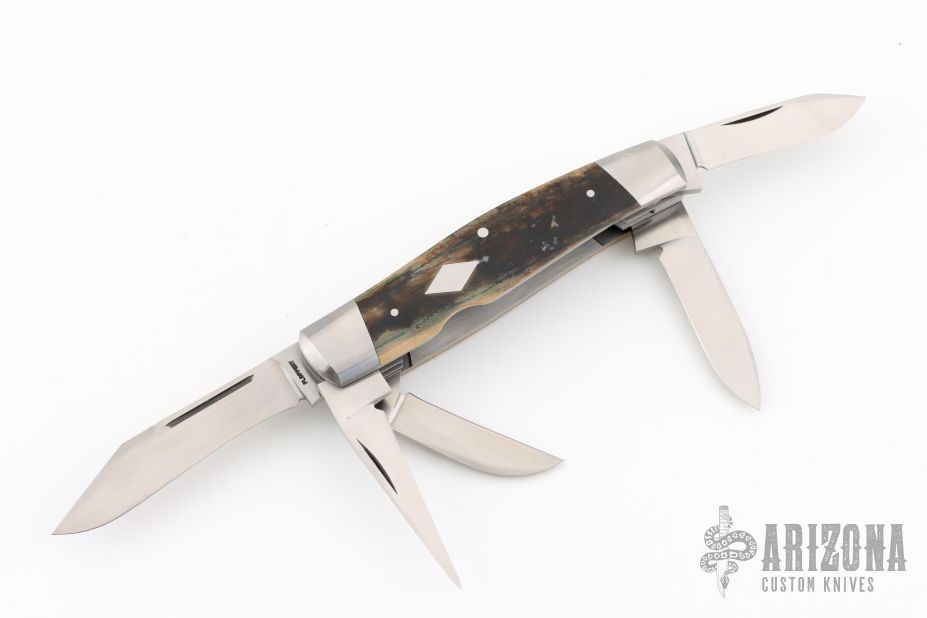 This 5-Blade Cattle knife by Tom Ploppert features hand rub satin finished blades with nail nicks. The handle has stainless steel bolsters, liners and springs with mammoth bone covers and a stainless steel escutcheon. Has half-stops on blades, flush in all positions. Excellent condition.