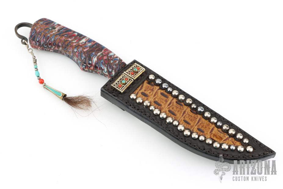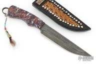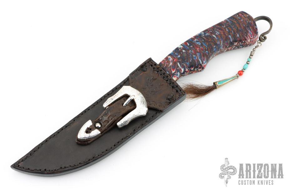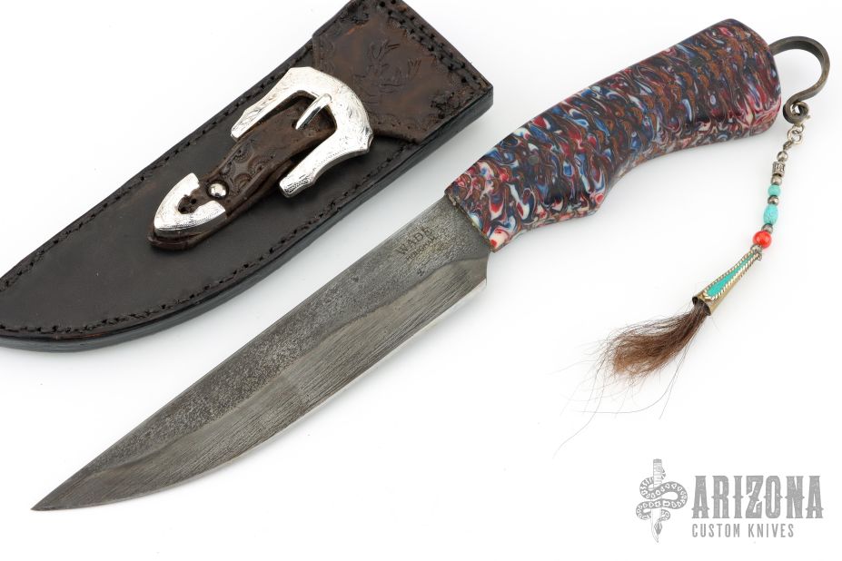 This camp knife Wade Hougham features an antique finished blade with hamon, .118" blade stock and 1.383" blade depth, hidden tang construction. The handle has a stabilized pine cone grip with red/white/blue resin, fancy coachwhip tail with beaded lanyard. Comes with a black leather sheath with embelishments. Excellent condition.