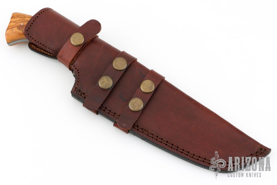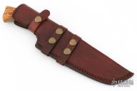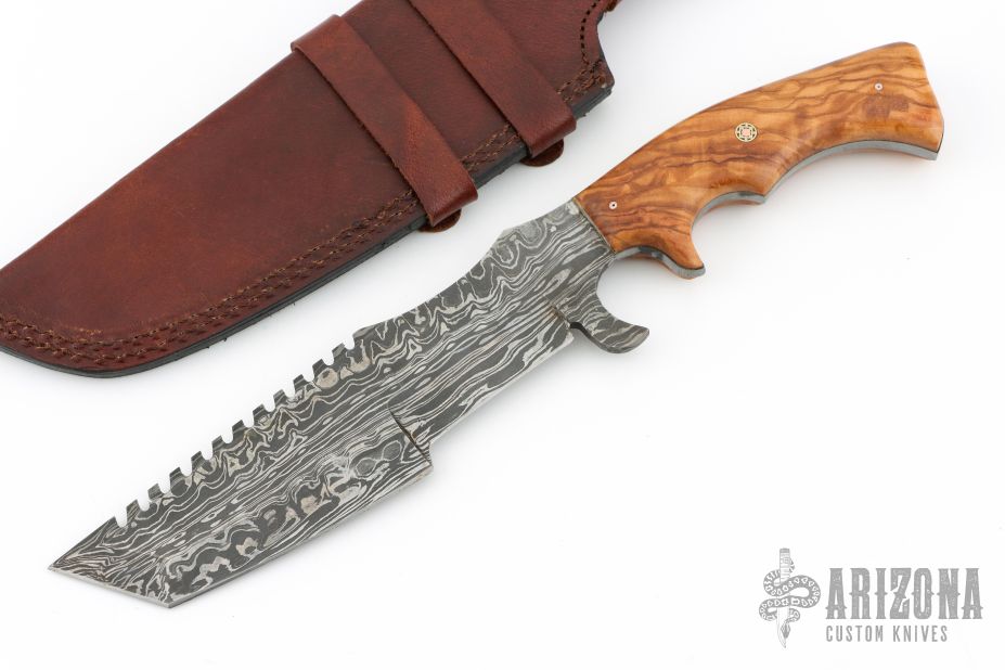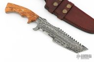 This knife features a Damascus blade with sawteeth on the spine, .178" blade stock and 1.939" blade depth, full tang construction. The handle has wood scales with mosaic pins. Excellent condition. Comes with a brown leather sheath.