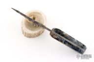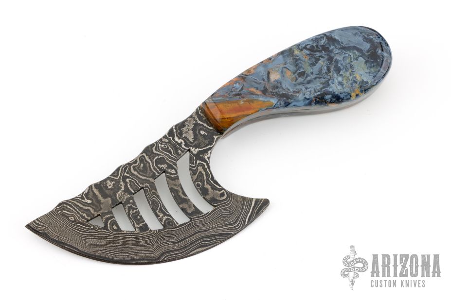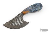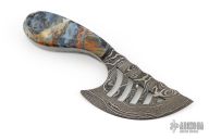 This knife features a Damascus blade with .130" blade stock and 1.857" blade depth, full tang construction. The handle has stone scales. Excellent condition.