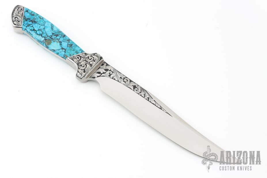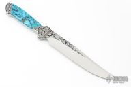 This knife by Norman Levine features a mirror polished clip point blade with false top edge, .185" blade stock, 1.197" blade depth, full tang construction. The handle has stainless steel bolsters, turquoise scales. The blade and the bolsters have been engraved by J Whitmore and dated 1991. Excellent Condition.