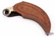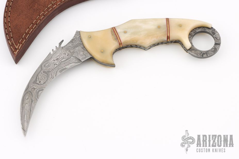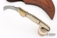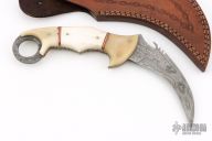 This knife features a Damascus double edged blade, .149" blade stock and 1.370" blade depth, full tang construction. The handle has bone scales with brass pins and red/brass spacers, brass liners, fileworked tang. Excellent condition. Comes with a brown leather sheath.