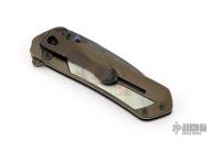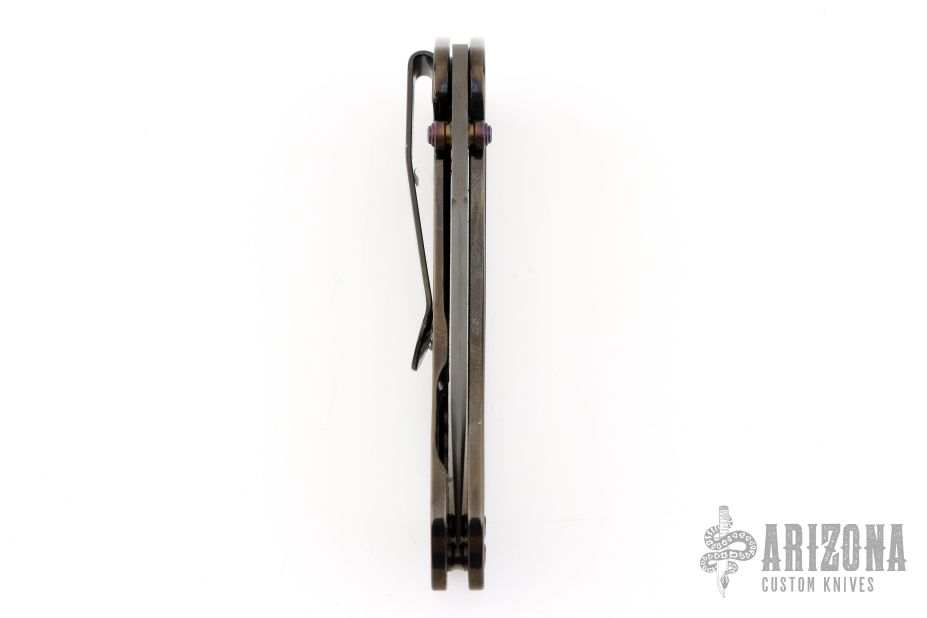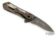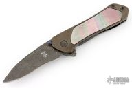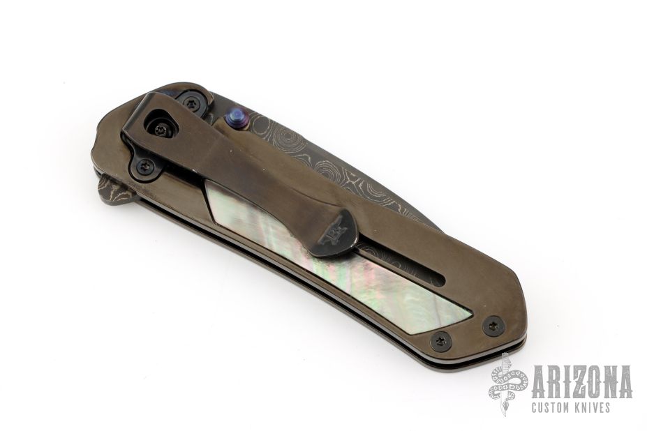 This Model 016 from Buck Knives features a drop point/recurve Damascus blade with swedge, dual thumb studs and flipper. The handle is comprised of DLC coated steel with black lip pearl inlays over DLC coated barrel spacers. Stainless steel tip down pocket clip. Includes original box and Certificate of Authenticity. Excellent condition.