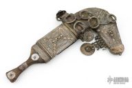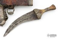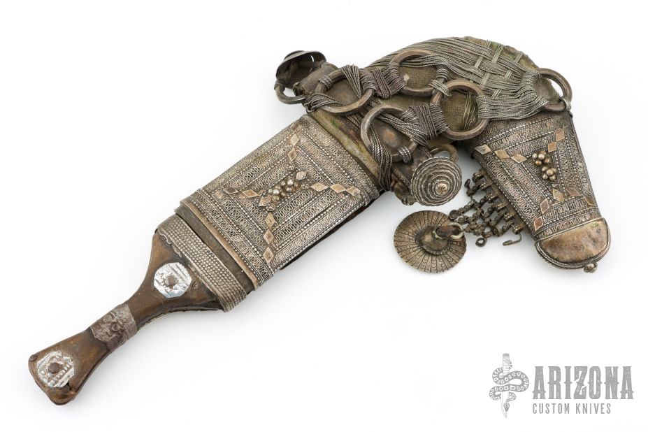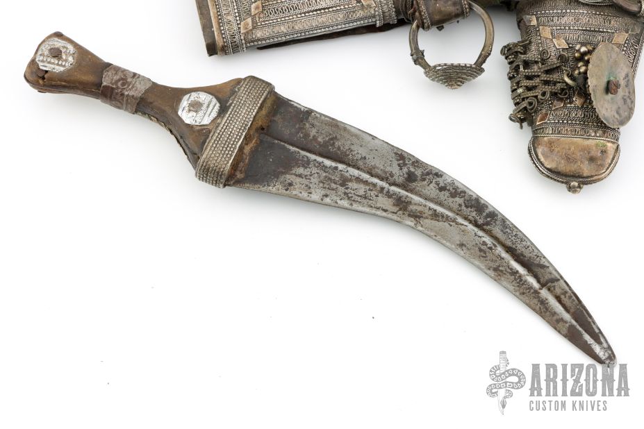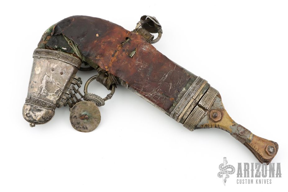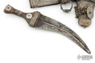 This knife features a double edged blade with ridge in the middle,.162" blade stock and 2.138" blade depth, full tang construction. The handle has nickel silver, aluminum and brass fittings with wood scales. Comes with a matching scabbard with tones of filigree. Has dings, scratches and oxidation, otherwise good condition for its age and for what it is.