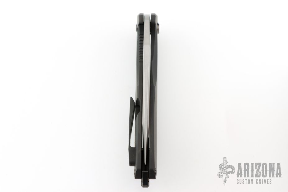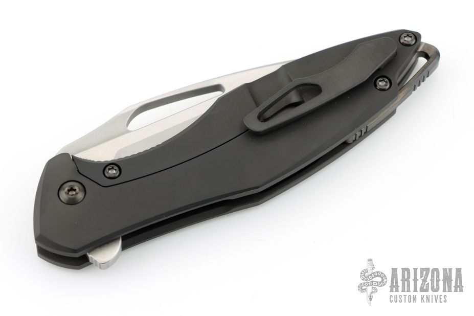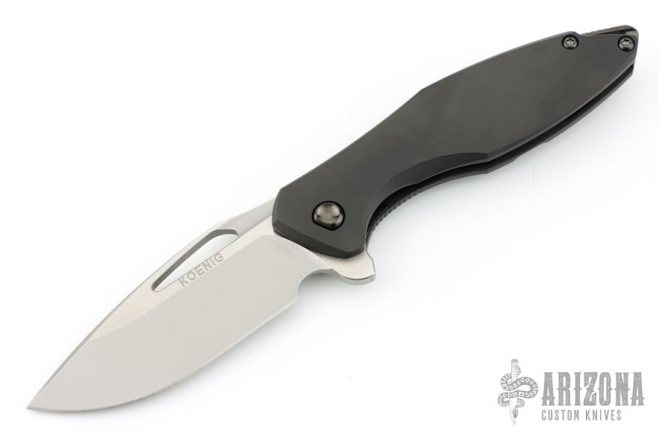 This Mini Arius by Koenig knives features a Burnished w/ Polished Flats finished blade with thumbhole and flipper. The handle has a DLC smooth titanium frame with a titanium tip up clip, titanium backspacer. Has ceramic bearings and a ceramic detent ball. Nice detent, lockup and blade seating. Comes with original box and COA May 6, 2025.  Excellent  condition.