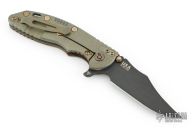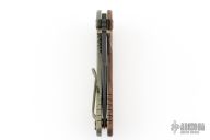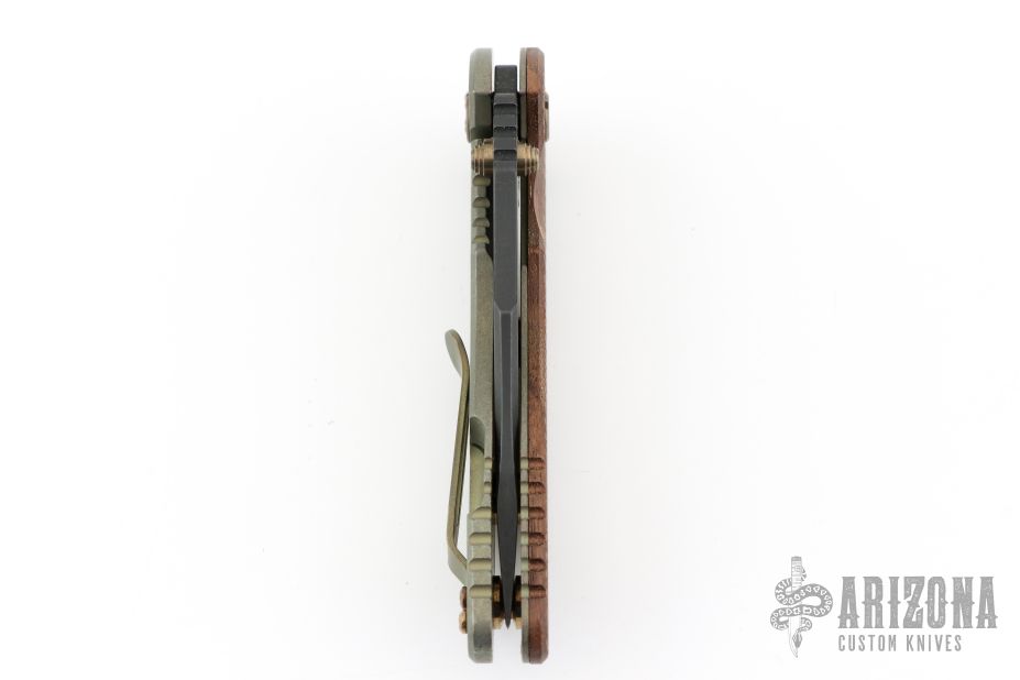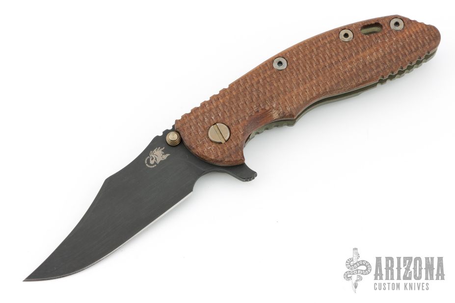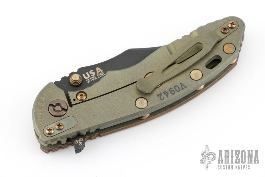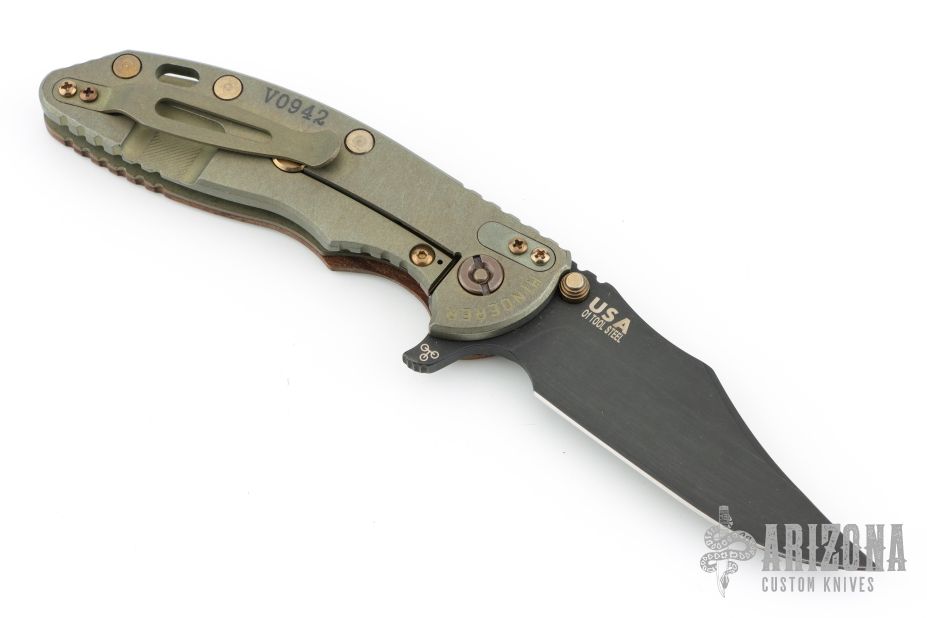 This Hinderer XM-18 3.5" Vintage Series model features a black coated O1 steel blade and a textured walnut wood handle with a green/bronze titanium frame. The Rick Hinderer XM-18 3.5" Vintage is a remarkable version of the famous Hinderer XM18. For this special version Hinderer became inspired by his love for firearms. The wood that is used for the handle of weapons, combined with the classic tool steel for the blade. A Vintage edition of an incredibly modern pocket knife. A top-quality work knife. The finish is simply perfect; grip wherever you might need it and curved wherever possible. As such it feels amazing in hand. When opened the flipper will keep your hands away from the edge. As such you never have to worry about slipping during the more demanding cutting tasks. The Bowie blade is made from O1 tool steel. Not stainless, but tough and easy to sharpen. With the right heat treatment it is a great type of steel to work with. In between the flipper and the edge you can find a finger choil. With it you have more control over the blade during the more detailed tasks. The stunning finish on the blade is striking. After all, the stonewashed finish has been enhanced with irregular and shiny highlights. These ensure that traces of use are hardly noticeable. In addition, it looks amazing! You easily open the XM18 with the (double) thumb studs, or with the flipper. With a small wrist movement you can easily open the blade. The knife has been enhanced with ball bearings which make sure the knife moves smoothly. However, it also comes with teflon and phosphor bronze washers. This is the Hinderer Tri-Way pivot system. When opened a solid framelock neatly keeps the blade in place. A characterizing detail here is the lockbar stabilizer. This is a round disc on the side of the titanium handle. It ensures that you cannot overstretch the lock. In addition, these Gen6 edition has been enhanced with a steel lockbar insert. You can always carry the XM-18 with you with the titanium pocket clip. This tip-down pocket clip is mounted to the right side, but with the Philips screwdriver you can easily turn it into a tip-up pocket clip. This Vintage edition is enhanced with a unique serial number, starting with a V. This one is V0942. Comes with original box and extra washers. Excellent condition.