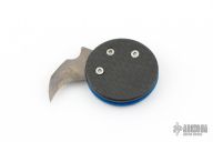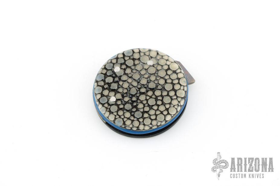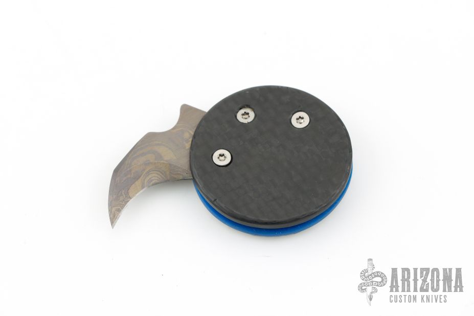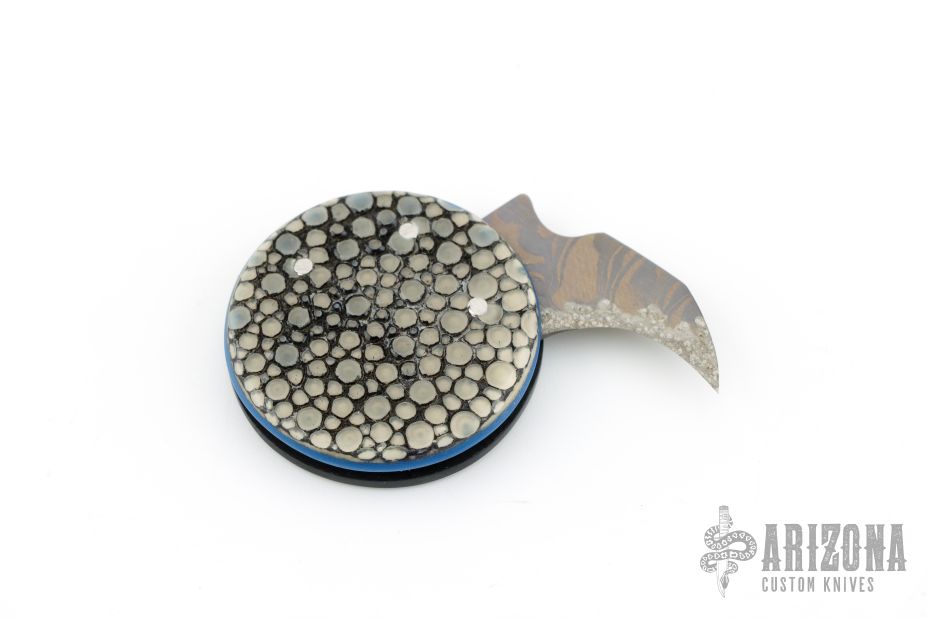 This coin knife by Warren Thomas features a chisel ground fingerprint anodized titanium blade with a carbide edge. The handle is carbon fiber on one side and stingray skin with a blue G-10 liner on the other. Excellent condition.