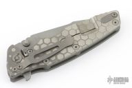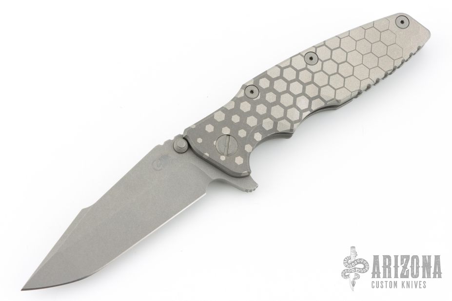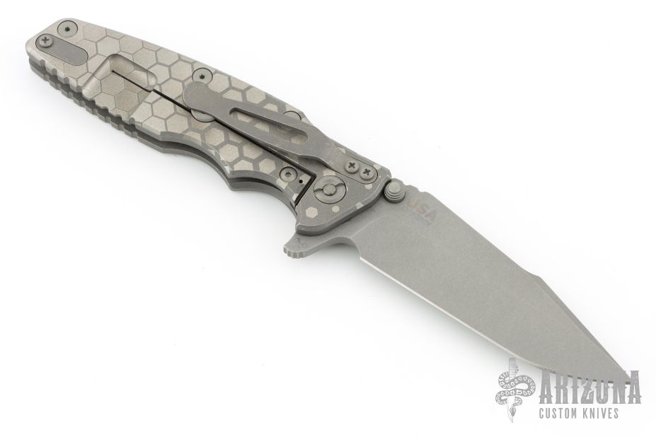 This Eklipse by Hinderer Knives features a working finished harpoon tanto blade with dual thumbstuds, flipper and notched thumbrest. The handle has a Honeycomb Fade Working Finish/Battle Grey Ti frame, titanium clip and hardware. Nice detent, lockup and blade seating. Comes with original box, card, and extra washers. Has some scratches on the clip. Excellent condition otherwise.