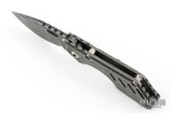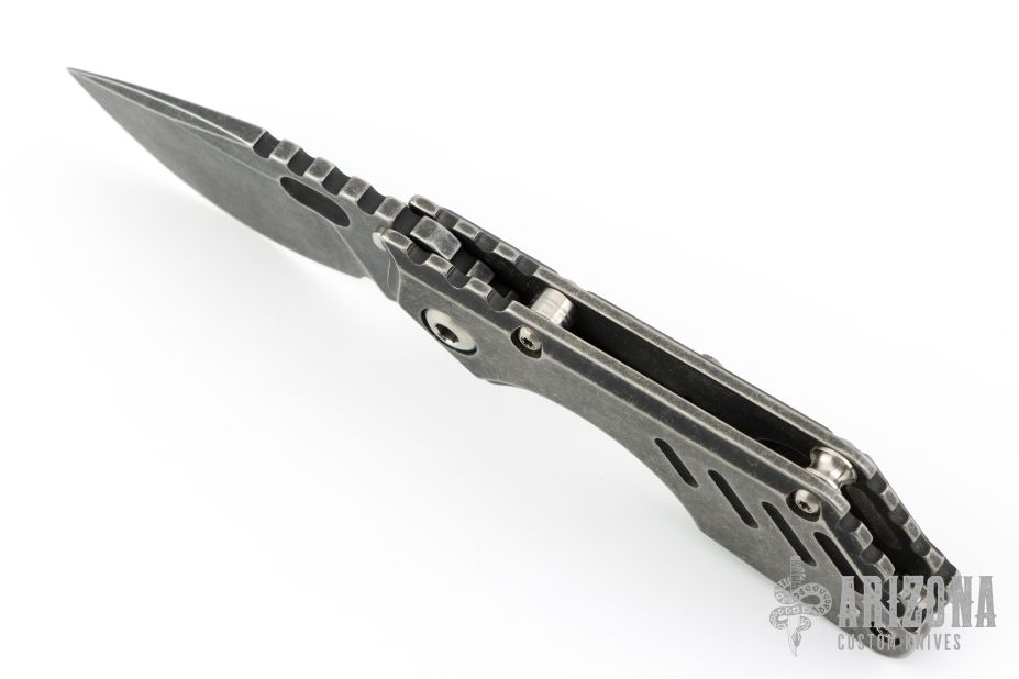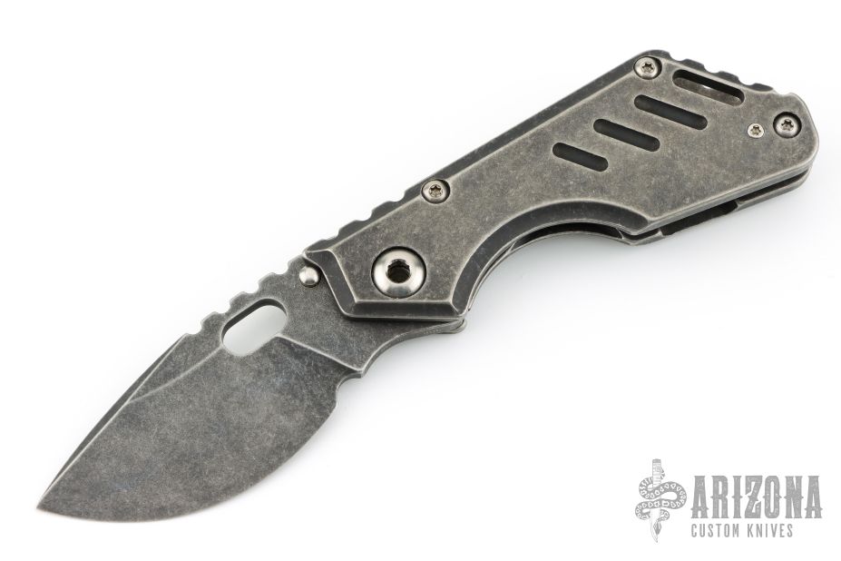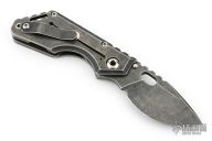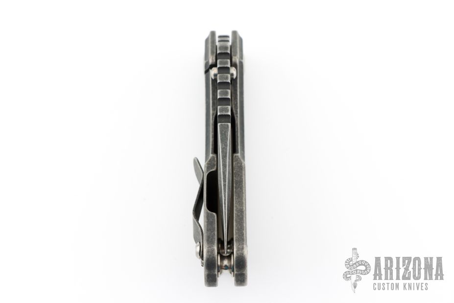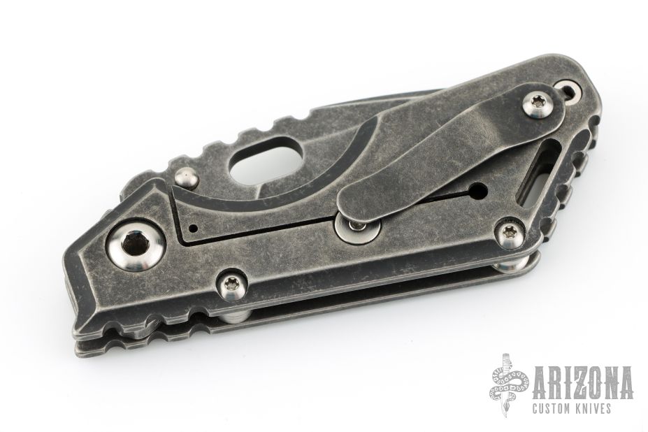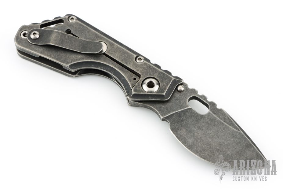 This Mick Strider custom Stub features a distressed blade with notched thumb ramp and swedge. The handle is distressed finished titanium frame with a pocket clip that has a matching finish and is positioned for tip up carry. Blade is centered when closed and locks up with no play. Excellent condition.