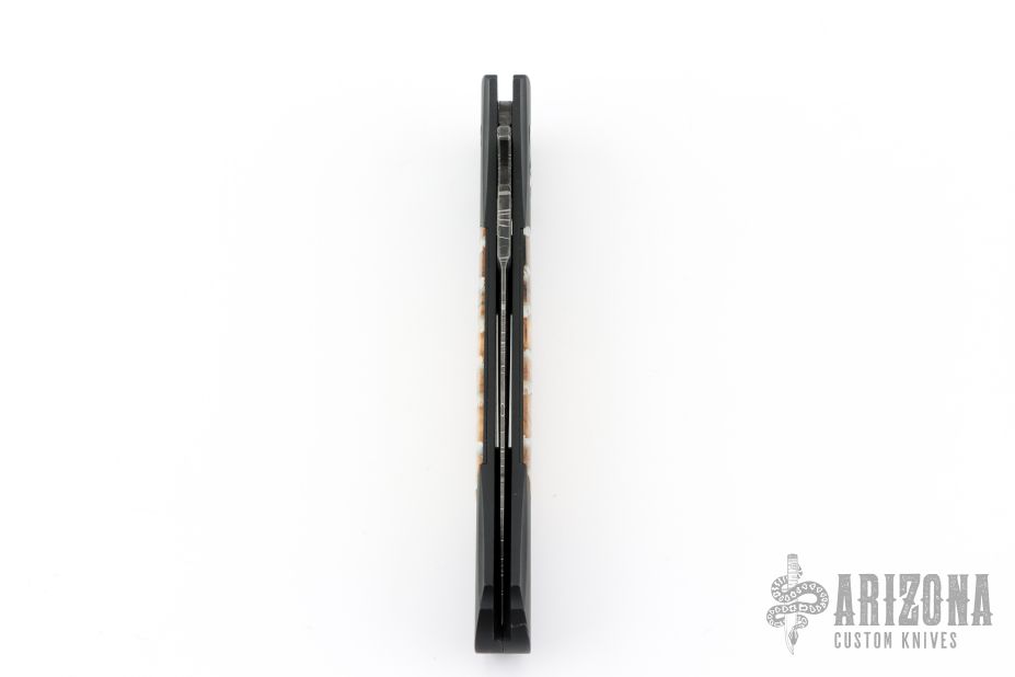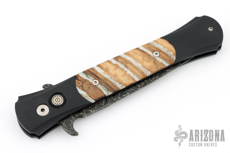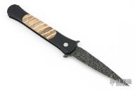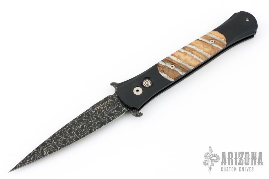 This Large Don Automatic from Pro-Tech features a damascus blade with false top edge and double integrated guard. The handle is comprised of a black aluminum frame with mammoth molar inlays and mosaic push button. Great blade seating and strong coil spring action. Comes with original white paper box, deluxe black clamshell style box, and original papers. Some minor carry marks on frame, but overall great condition.