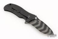 This 0303 frame-lock assisted flipper by Zero Tolerance features a recurve spear-point blade with a tiger stripe finish, stainless steel liner black G10 scale, and titanium scale with a black G-10 backspacer. Has custom skull anodizing, custom tip up titanium clip with bronzed screws. It also features the Speed-safe assisted opening system. Black stainless steel clip and lock bar stabilizer. Clip is 4-way reversible. Has a couple light scuffs, Excellent condition. Comes with original box and papers.