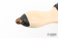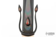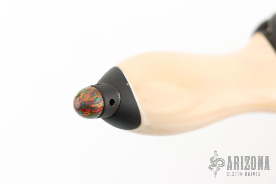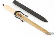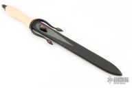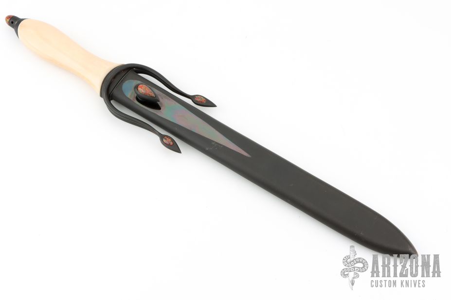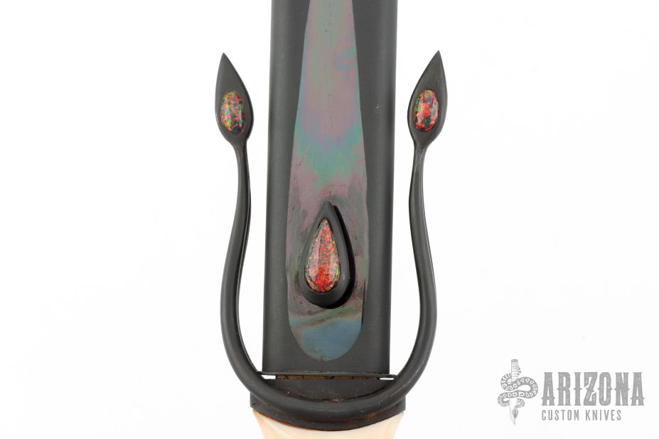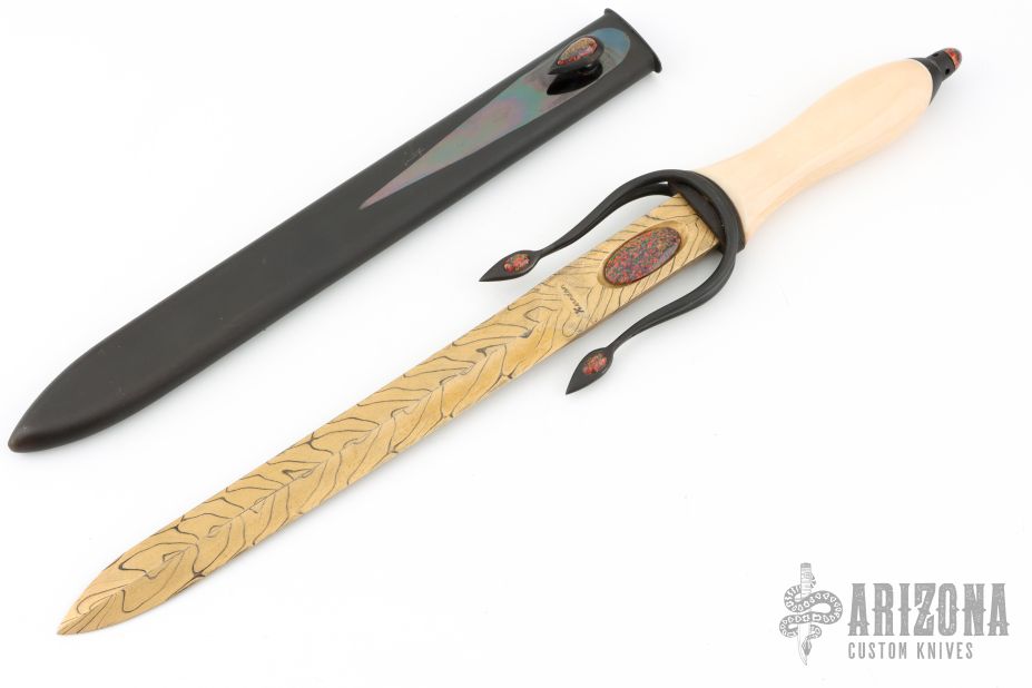 This Art Dagger by William Herndon features a gold colored Damascus blade with unsharpened edges, faux opals on the ricasso, .216" blade stock and 1.080" blade depth, hidden tang construction. The handle has a decorative black steel guard with leaf ends and faux opals, matching butt with a faux opal in the tang nut, and a fossil walrus ivory grip. The tang nut can be removed and the knife is a takedown model. Comes with a matching two-tone black steel scabbard with faux opal inlaid in the belt stud. Has some light scuffs on the fittings and the scabbard, otherwise excellent condition.