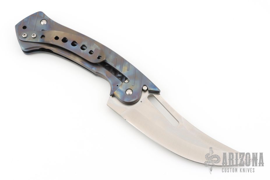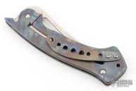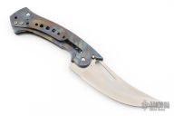 This knife by Steve Ryan features a satin finished partially trailing-point blade with thumbhole. The handle has a milled and flamed titanium frame, titanium barrel spacer and matching titanium tip up clip. Nice detent, lockup and blade seating. Excellent condition.
