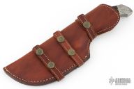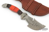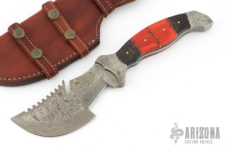 This knife features a Damascus blade with sawteeth and fileworked spine, .163" blade stock and 2.474" blade depth, full tang construction. The handle has Damascus bolsters, wood scales with brass spacers and pins, fileworked brass liners. Has some light oxidation, otherwise good condition. Comes with a brown leather sheath.