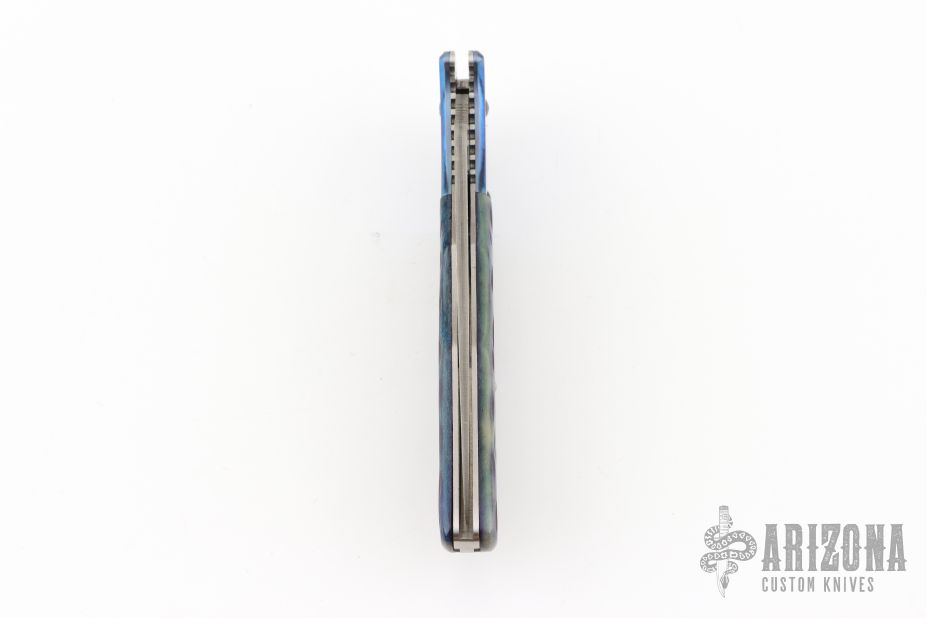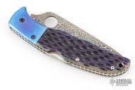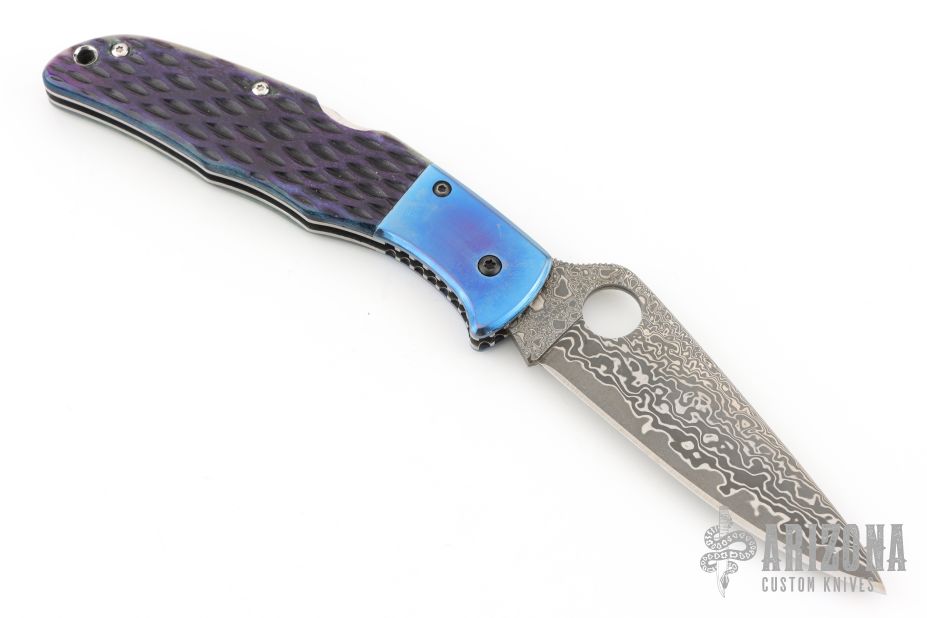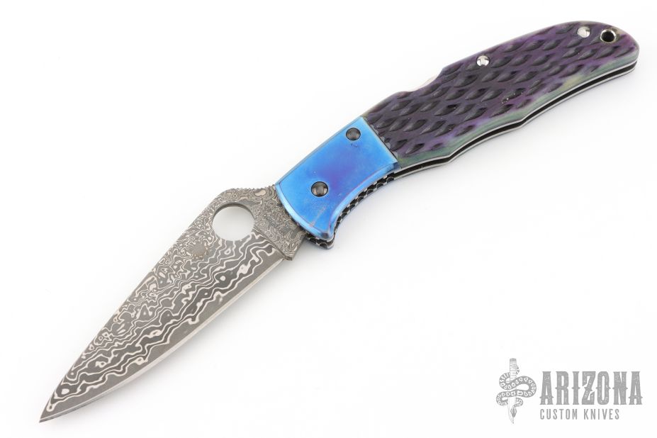 This Endura Lockback Folder has a Damascus VG-10 clip/ spear point blade with thumb hole and notched thumb ramp. Handle is beautiful blue jigged bone with blue anodized titanium bolsters, stainless steel lock/ spacer, and fileworked stainless steel liners. Has some light scratches otherwise excellent condition. Comes with a zippered case.