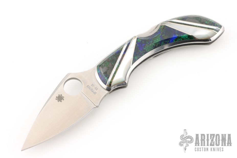This Dragonfly Lock Back folder by Spyderco features a satin finished blade with thumbhole. The handle has a stainless steel frame with green/blue stone and mother of pearl overlay, tip up stainless steel clip. Has a couple light scratches, excellent condition otherwise. Comes with original box and papers.