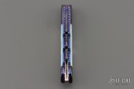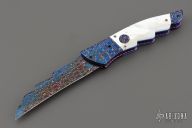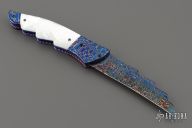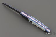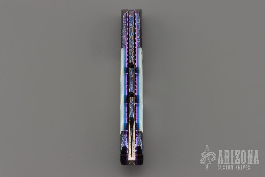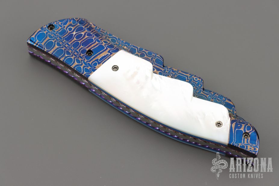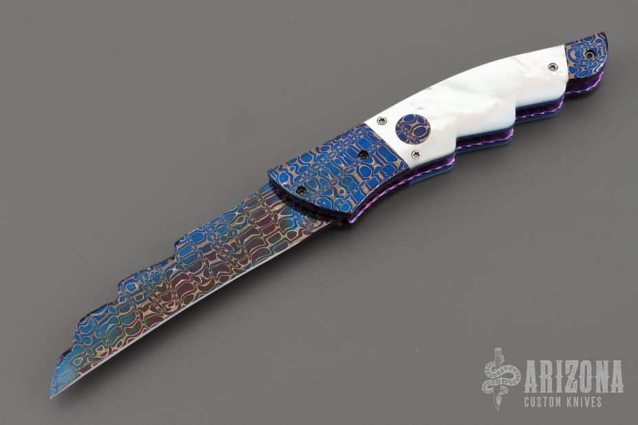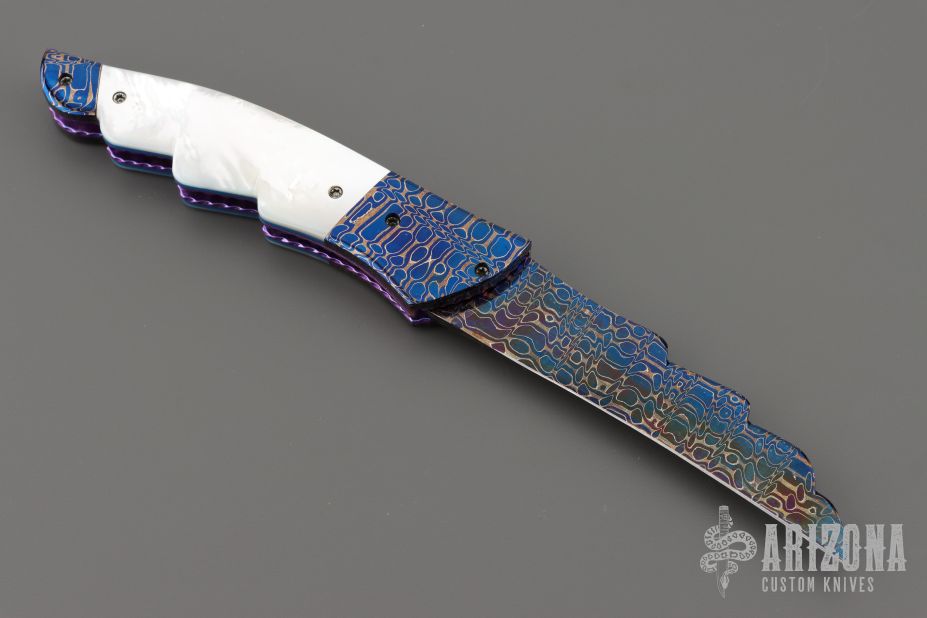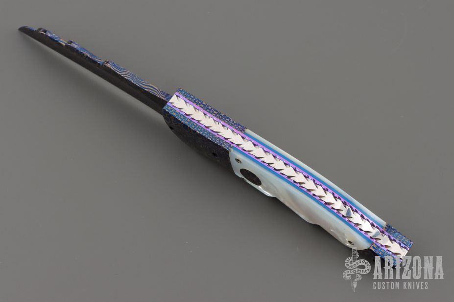 This Angel Wing side-opening automatic by Rainy Vallotton features a hot salt blued Chad Nichols Cheetah Pattern Damascus blade, matching Damascus double bolsters, and mother of pearl scales. Matching mosaic Damascus push button. Fileworked stainless steel backspacer, anodized and fileworked titanium liners with jeweled interiors. Strong and fast leaf spring action. Nice action, lockup and blade seating. Excellent condition. Includes original box, but the COA is no longer with the knife. We know this is the prototype because we have sold this exact knife before in 2013. When we had it then, it has the certificate of authenticity identifying it as a prototype.