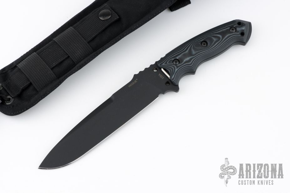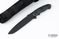 This EX-F01 is an Allen Elishewitz design executed by Hogue Knives. It features a black coated drop point blade with swedge and notched thumbrest, .238" blade stock and 1.562' blade depth, full tang construction. The handle black G-Mascus scales. A hidden compartment can be accessed by using the wrench that nests in the "A" side of the of the handle. Includes MOLLE compatible nylon sheath with belt loop and original box. Has a couple light sheath scuffs, Excellent condition otherwise.
