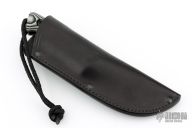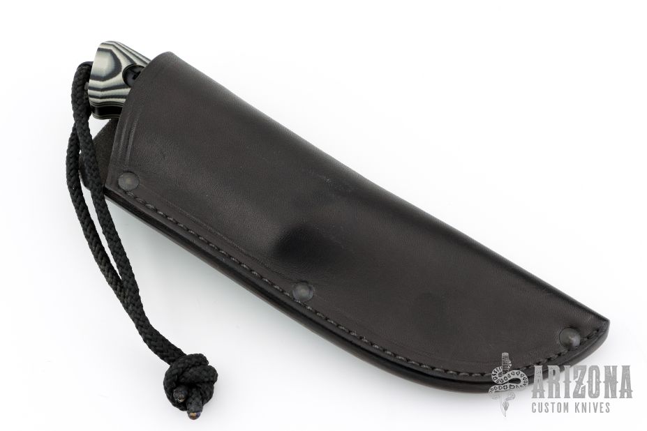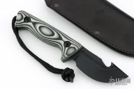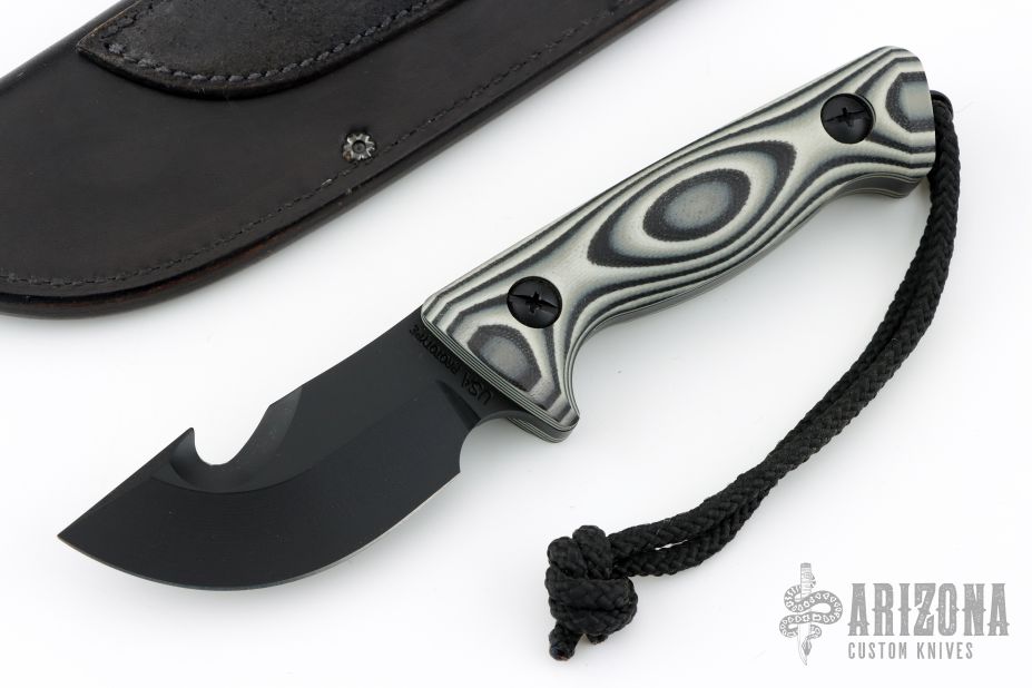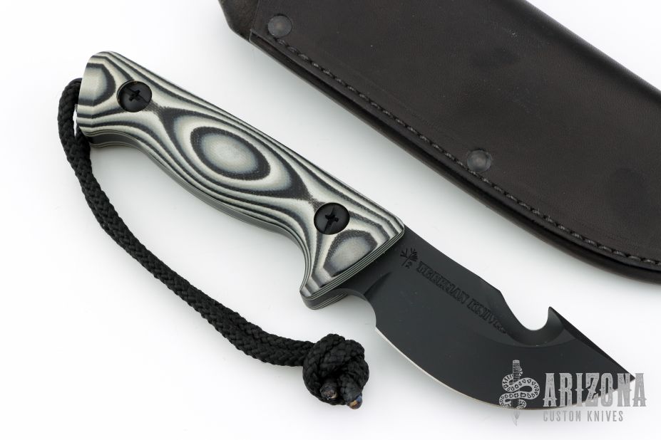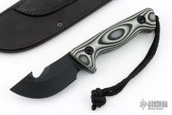 This knife by Treeman Knives has an upswept blade with a false top edge and gut hook. The blade is 57/58 Rc and vacuum heat treated in a state of the art furnace. It will out cut and hold an edge as good as or better than any knife made. The blade thickness is .251" thick and 1.451" deep. The handles are textured and layered white/black/gray G10. Comes with a Mosher leather sheath with belt loop. Excellent condition.