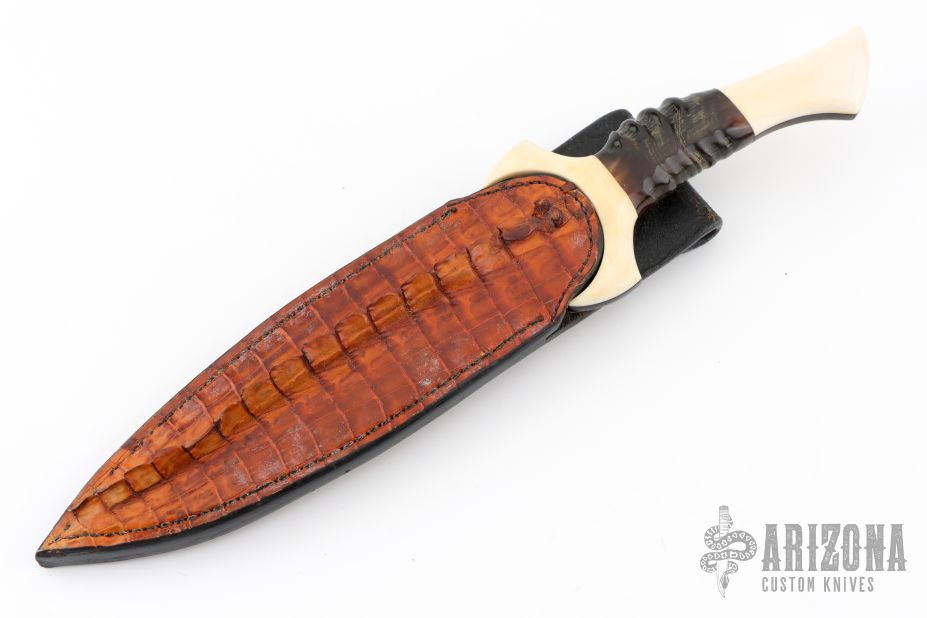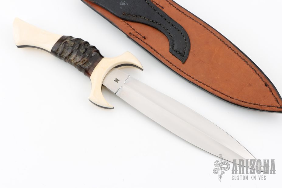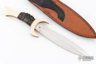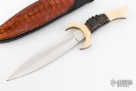 This Dagger by Chris Miller features a mirror polished double edged blade with .187" blade stock and 1.261" blade depth, hidden/frame tang construction. The handle has mammoth ivory guard and butt with an Ibyx horn grip, and a wood frame. Comes with brown leather sheath with crocodile skin overlay. Excellent condition.