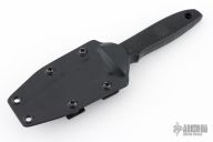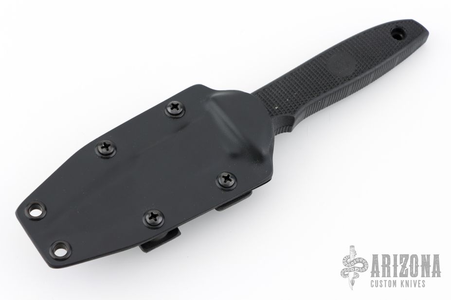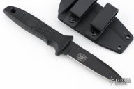 This M-10 by Gryphon Knives is a Bob Terzuola design, it has a VG-10 black spear point blade with notched thumbrest, .172" blade stock and .886" blade depth, hidden tang construction. The handle has a black FRN grip with lanyard hole. Comes with kydex sheath with belt clip. Excellent condition.